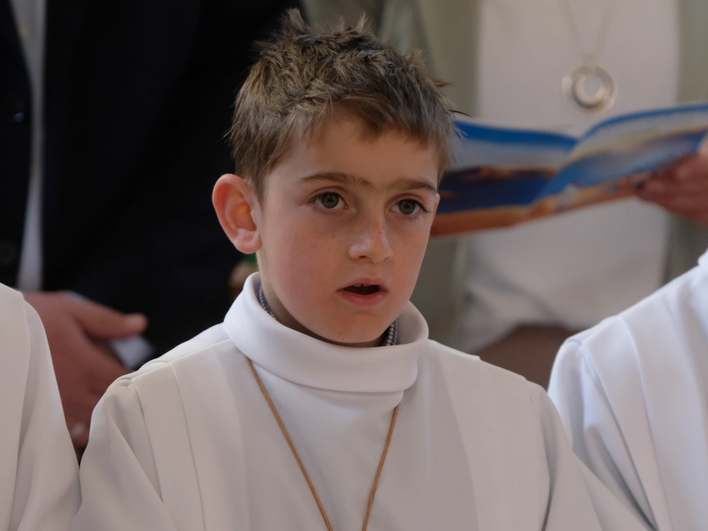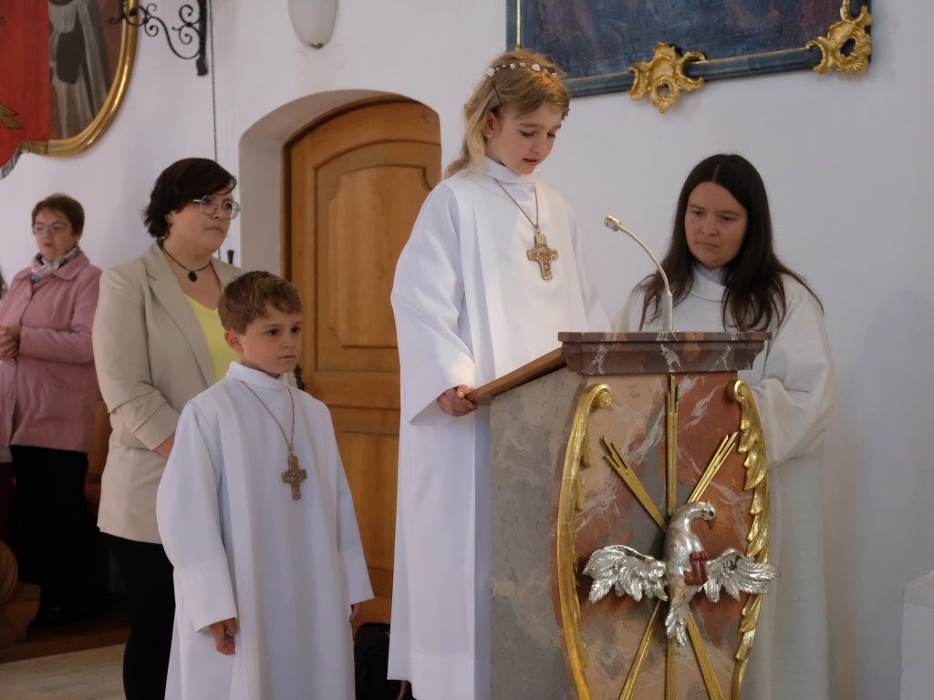 Nach dem Entzünden der Kommunionkerzen und dem feierlichen Einzug war es an der Zeit, sich gegenseitig zu begrüßen: Pfarrer Stefan Maier begrüßte als Zelebrant die Kinder, diese wiederum freuten sich, ihre Eltern, Geschwister und Verwandten bei diesem Festgottesdienst begrüßen zu können. Im Anschluss an Kyrie, Gloria, dem Tagesgebet und der Lesung sang man gemeinsam das Motto-Lied der diesjährigen Erstkommunion „Kommt her und esst.“ Angelehnt ist das Motto an das Mahl des auferstandenen Jesus Christus mit seinen Jüngern (Joh 21,1-14).