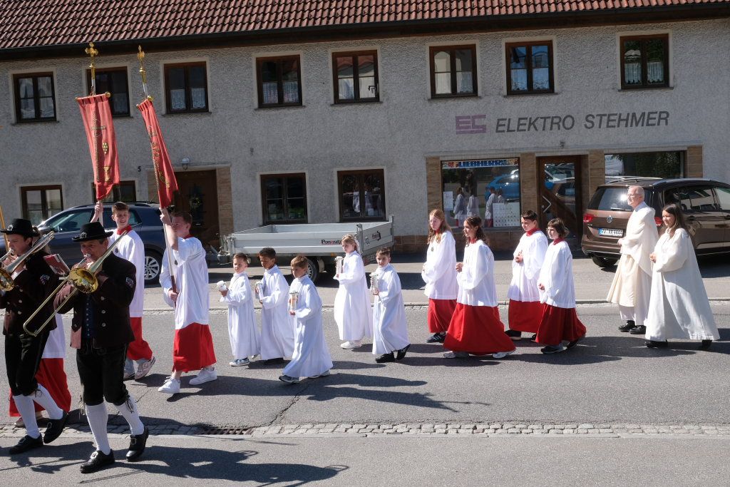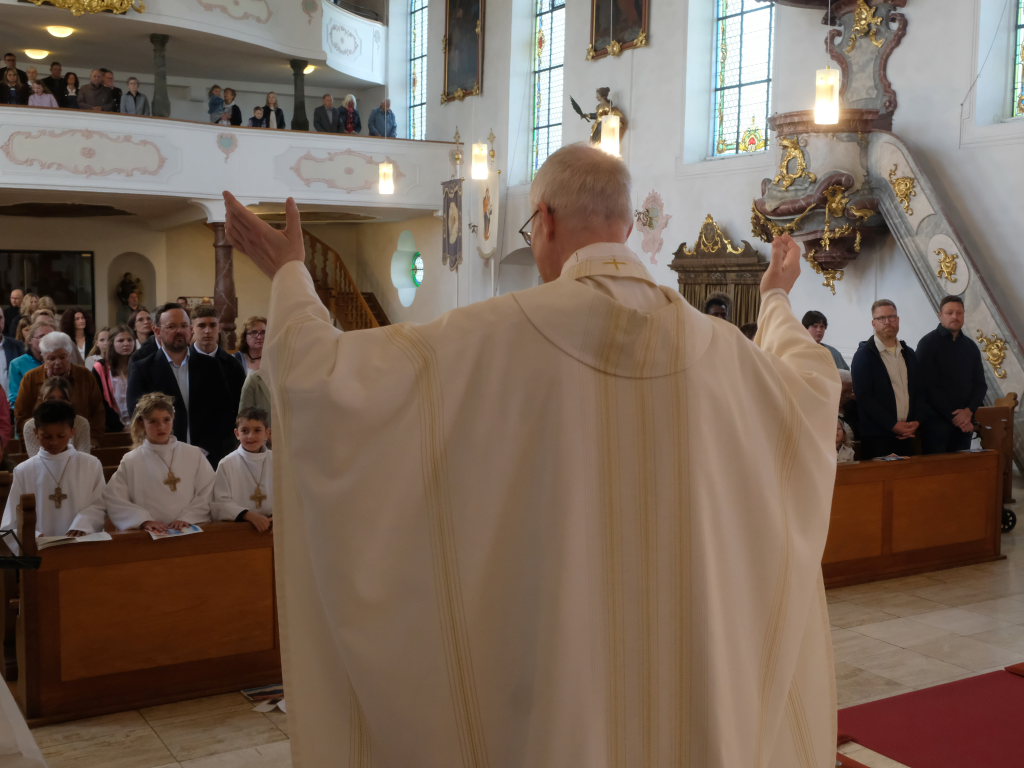 Mit dem Danklied „Wo Menschen sich vergessen“ leitete Pfarrer Maier nach einigen Dankesworten an die Beteiligten zum Schluss-Segen über, ehe die Gemeinde mit dem gern gesungenen „Großer Gott wir loben Dich“ den Auszug der Kommunionkinder begleitete.