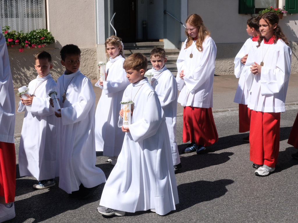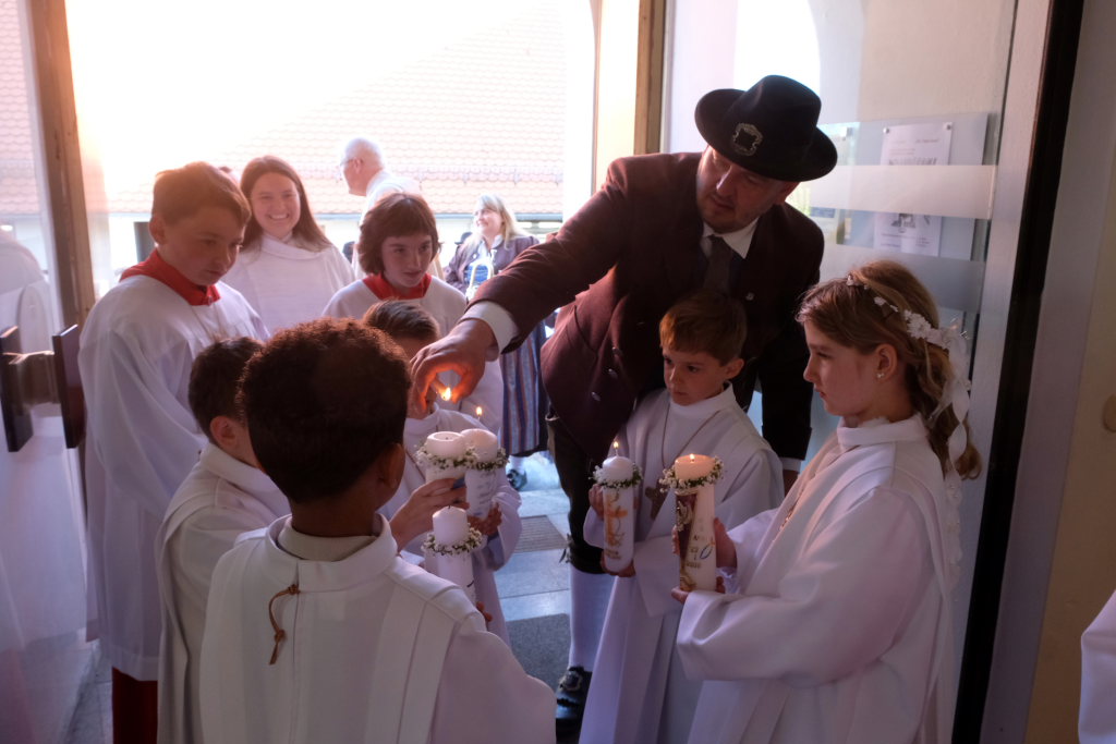 Nach der Einstimmung auf den großen Tag im Gemeindehaus geleitete die Musikkapelle Arnach die Kinder musikalisch zur Kirche, wo eine kleine Besetzung für den feierlichen musikalischen Rahmen des Gottesdienstes sorgte.