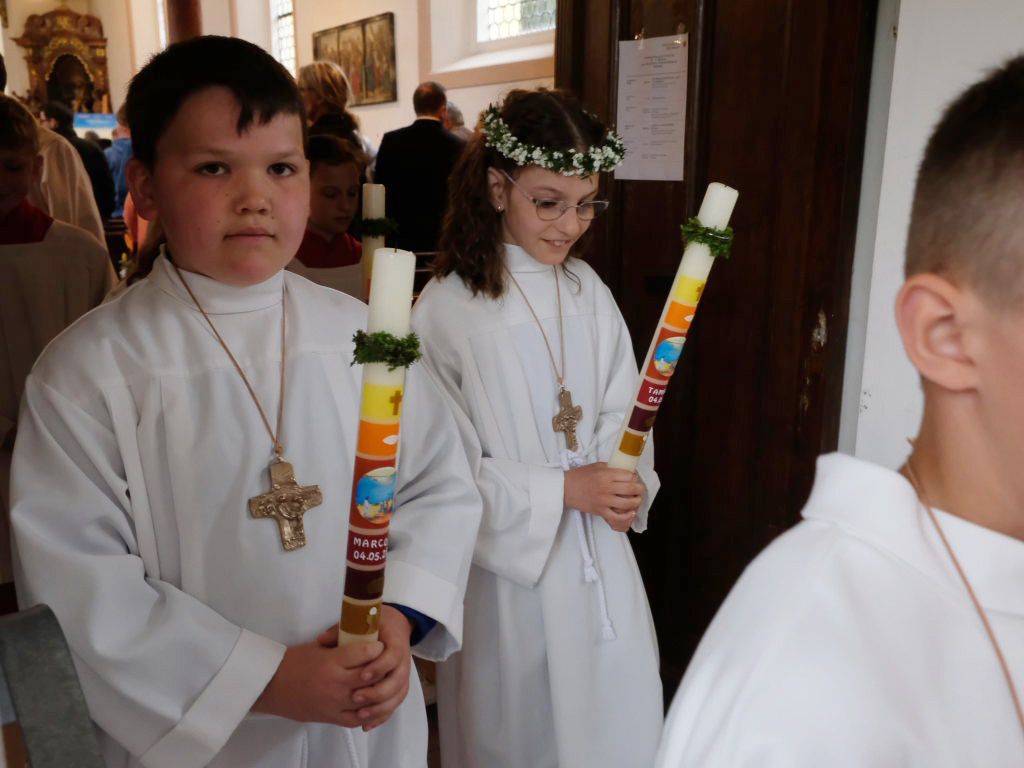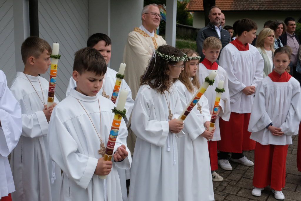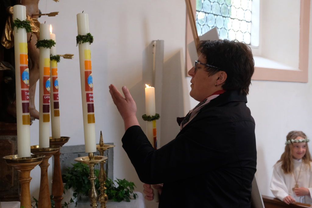 Bei Karin Kasper als gewählte Vorsitzende des Kirchengemeinderates Dietmanns bedankte sich Pfarrer Maier, weil sie maßgeblich dafür gesorgt hatte, dass die Kirchengemeinde Dietmanns ihr Gotteshaus für die Kommunion zur Verfügung stellte. Sie war es auch, die mit der an der Osterkerze angezündete Flamme die gemeinsam selbst hergestellten Kommunionkerzen entzündete. Nach der liturgischen Eröffnung durch Pfarrer Maier war es an den Kindern, ihre Eltern, Geschwister, Großeltern und weitere Verwandten an ihrem großen Tag begrüßen. Im Anschluss nach Kyrie, Glorie, dem Tagesgebet und der Lesung sang man gemeinsam das Motto-Lied der diesjährigen Erstkommunion „Kommt her und esst.“