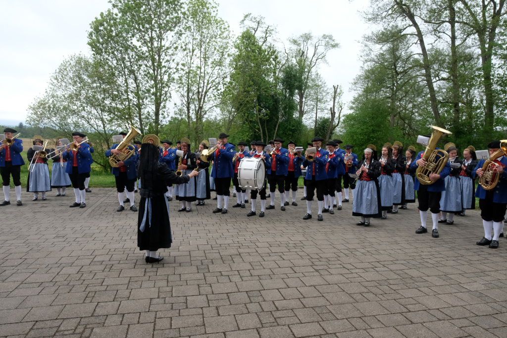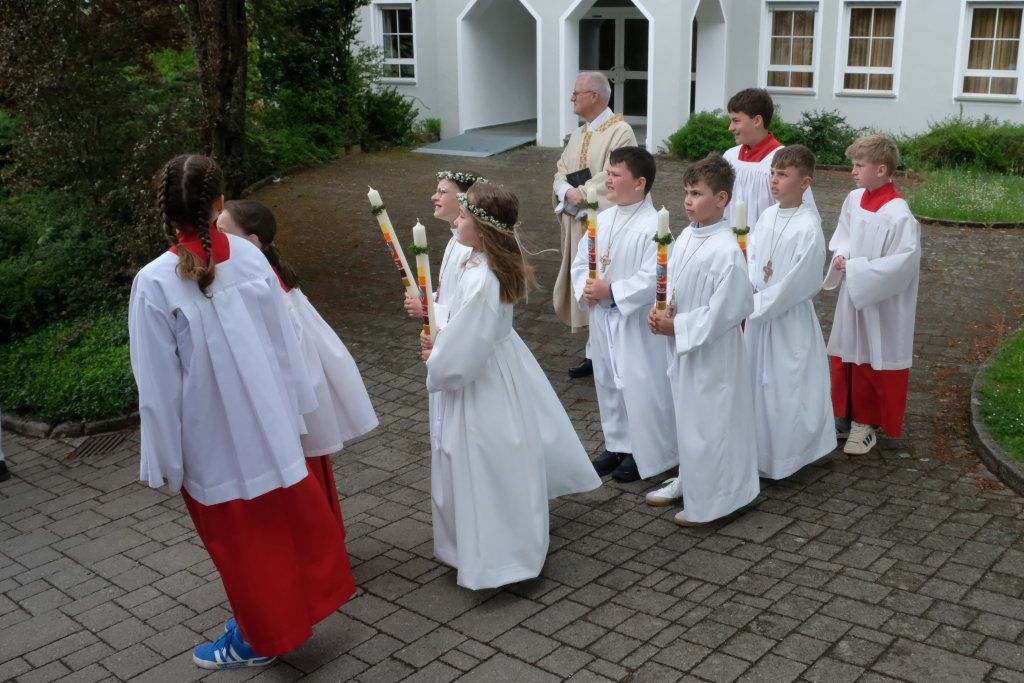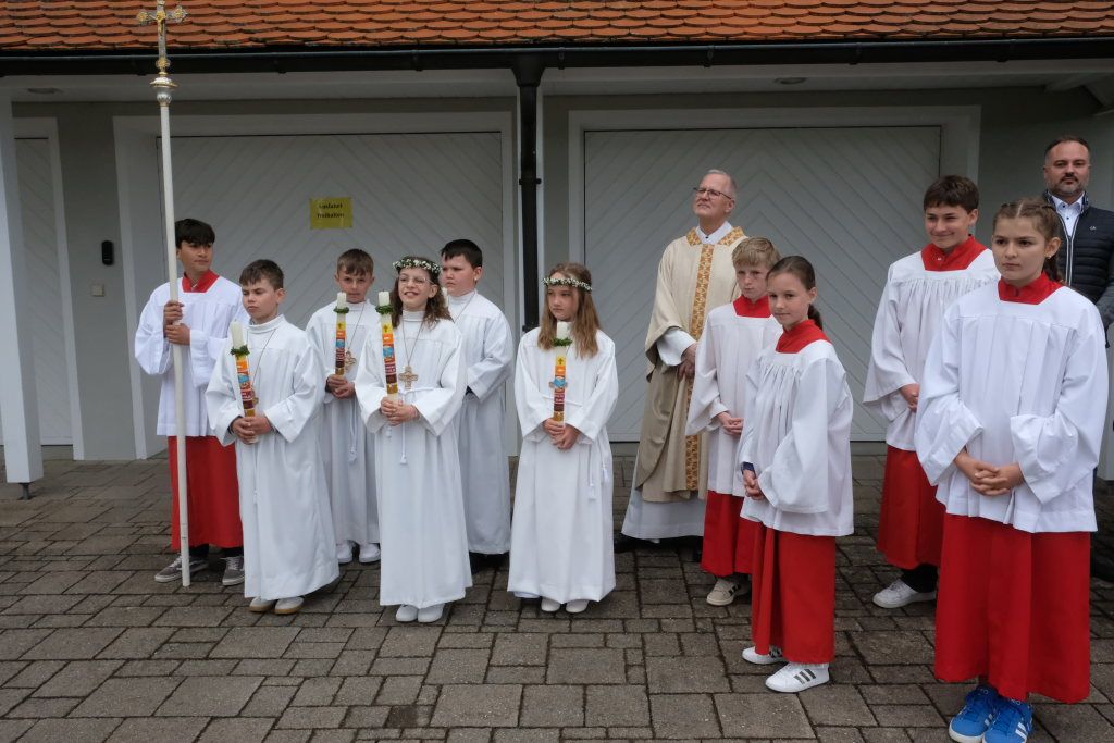 Nach dem Segen zum Abschluss des Gottesdienstes wurden die Kinder von Pfarrer und Ministranten zu den Klängen von „Großer Gott wir loben Dich“ aus der Kirche geleitet, vor der bereits die Musikkapelle wieder Aufstellung genommen hatte, um sie zum Gemeindehaus zu geleiten, wo sie den Kindern und Eltern noch einige Musikstücke zum Geschenk machten.