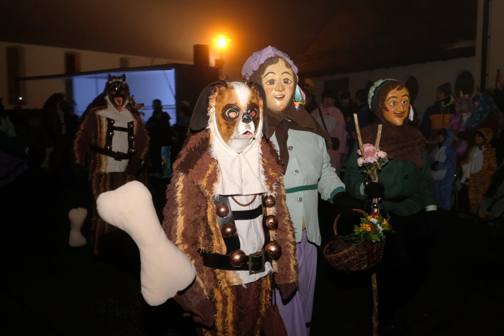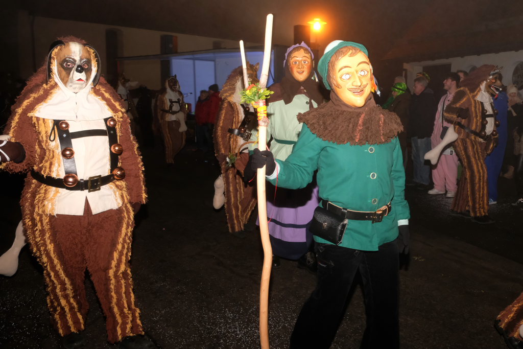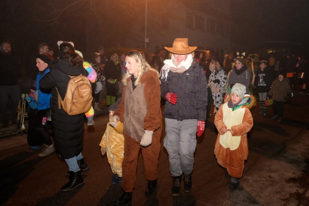 Trotz ihres eigenen großen Jubiläums – sie feiern in diesem Jahr ihr 50jähriges Bestehen – kamen Chadaloh, Pebo, Hugibold und Co. aus dem in Sichtweite liegenden Nachbarort Haidgau herüber, um mit den „Bockländern“ zünftig zu feiern. Und auch die Bad Wurzacher Narrenzunft Riedmeckeler war mit fast allen Häsern vertreten, nachdem diese den ersten Sprung in Eintürnen noch verpasst hatten. Ebenfalls an diesem Abend dabei waren auch die Schoafböck aus Arnach und die Narrenzunft aus Rötenbach, die ihren Narrenruf „Hundsknochen – wau, wau“ erschallen ließ nachdem, ihre hauseigene Guggamusik für Stimmung gesorgt hatte. Als vierte Musikgruppe konnten die Eintürner Narren die kleine Blaskapelle „Katzenwäldle“ aus Bergatreute für ihren Umzug begeistern. Großes Hallo und Umarmungen für „ihre“ Annika gab es mit den Torfstechern aus Waltershofen, die es sich aber nicht verkneifen konnten, eine Konfettispur in ihrer Haarpracht zu hinterlassen.