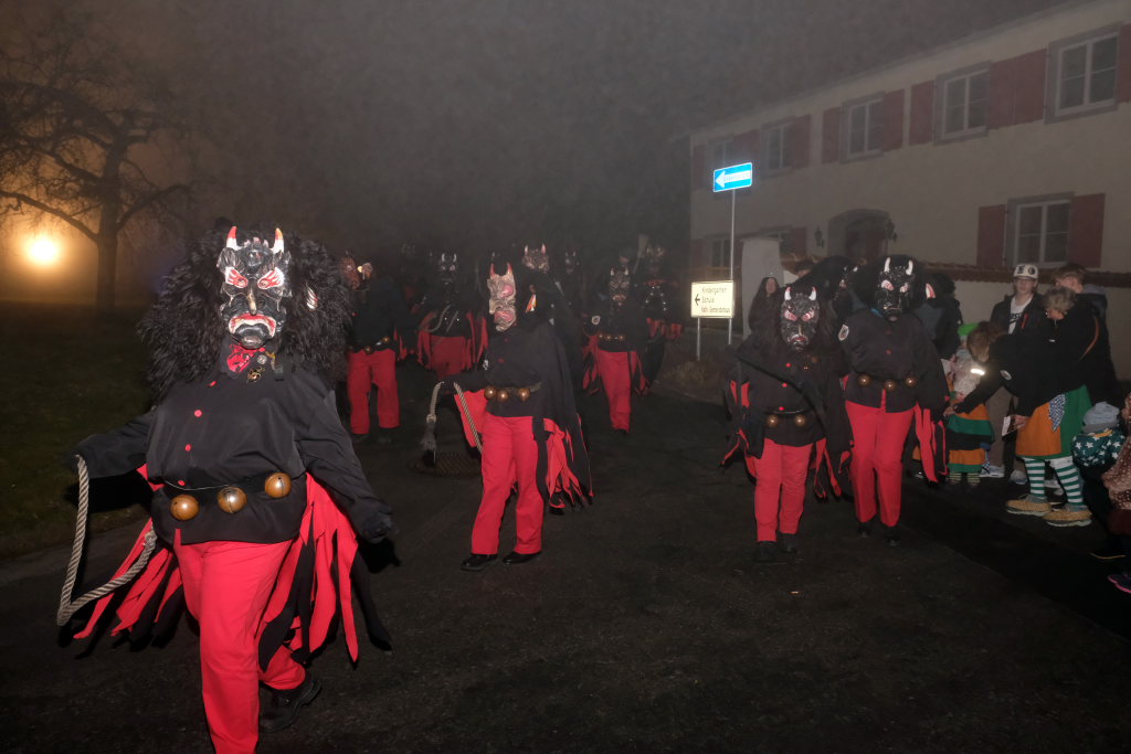 Auch für die Kindergarten- und Grundschulkinder Eintürnens wurde der Narrensprung zu einem unvergesslichen Erlebnis, durften sie doch als Haustierzirkus mit ihrem „Mäh, Miau und wau – des kenned mir au“ gleich nach der Narrenzunft den Weg rund um den Pfarrgarten antreten. Und hatten dabei auch noch musikalische Begleitung durch die Musiker des Musikvereins Eintürnen. Denen folgten die Höllteufel aus dem benachbarten Alttann, die früher zu Zeiten der Elterngeneration der Kindergarten- und Schulkinder oft die Schülerbefreiung am Gumpigen in Eintürnen vornahmen.