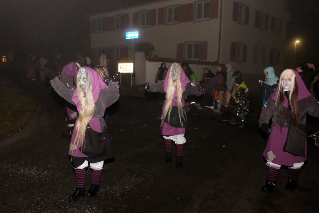 An der Ecke Pfarrhaus/ Kirche kommentierte Zunftmeisterin Christine Veser gemeinsam mit der gebürtigen Eintürnerin Annika Bodenmüller von den Waltershofenern Torfstechern das närrische Defileé. Die Zuschauer und Ansagerinnen bekamen nach den Höllteufeln es dann mit den Immenriedern Fehla samt dem dazugehörigen Teufel zu tun. Nach den ebenfalls noch aus der Region stammenden Allmishofener Feuerhexen bevölkerten die Hagsbergweible der Narrenzunft Butterweible aus Wiggensbach bei Kempten die Straße bei Kirche und Rathaus, die die Guggamusik Flachsheular aus Sonthofen in ihrem Schlepptau hatten.