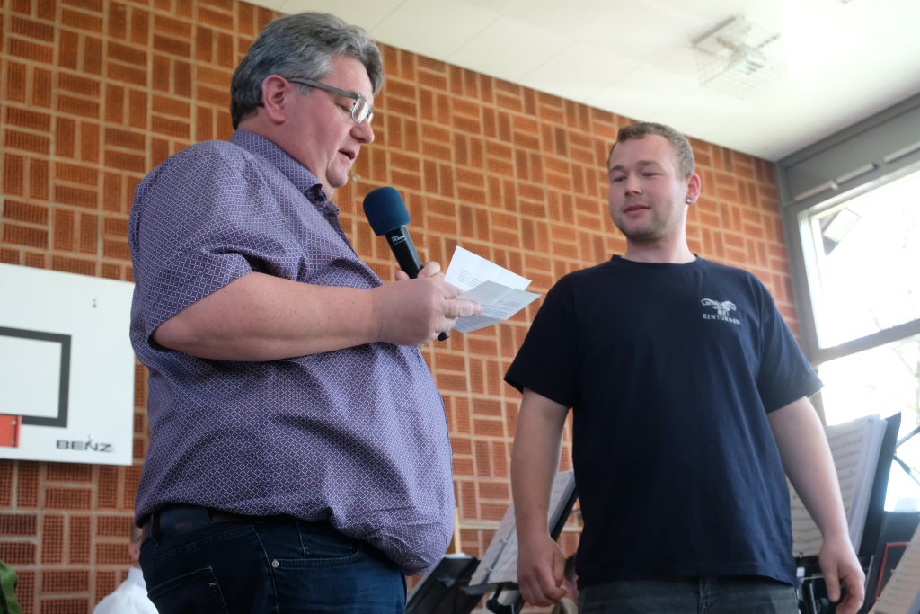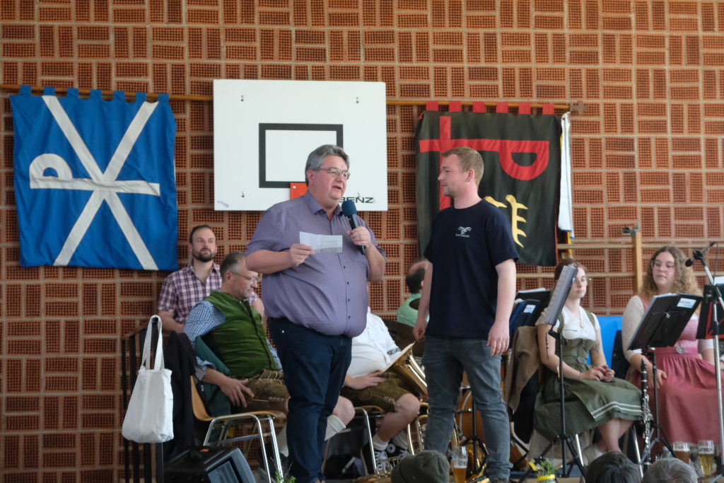 Ortsvorsteher Berthold Leupolz, einst selbst Landjugendvorstand, im Gespräch mit Felix Maucher, der zusammen mit Simon Traub die heutige Landjugend führt.