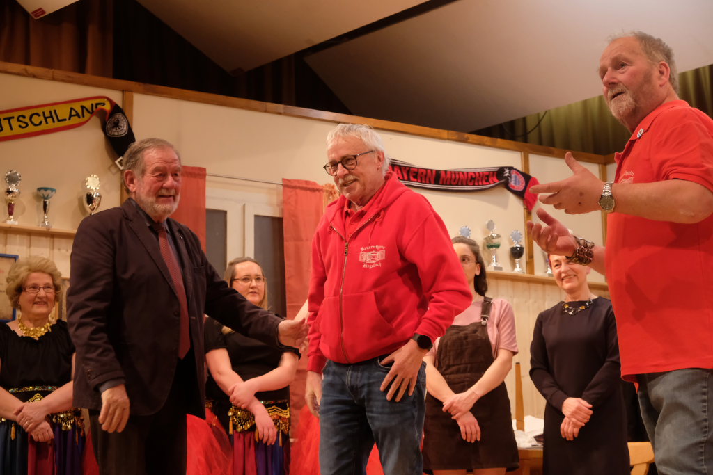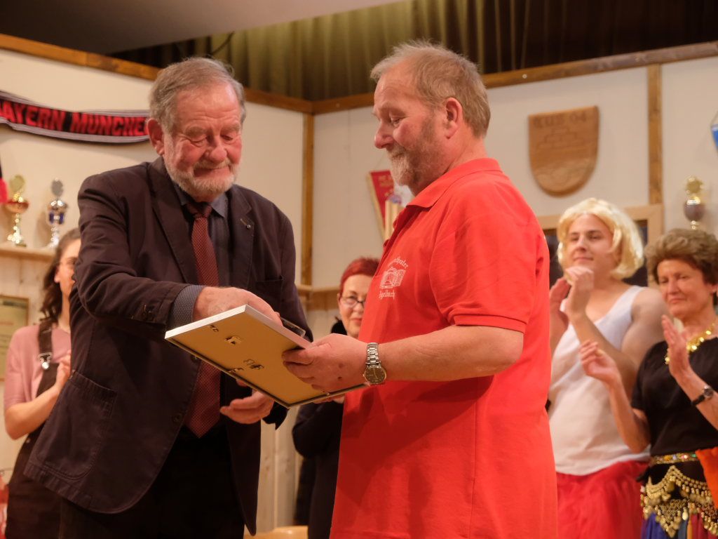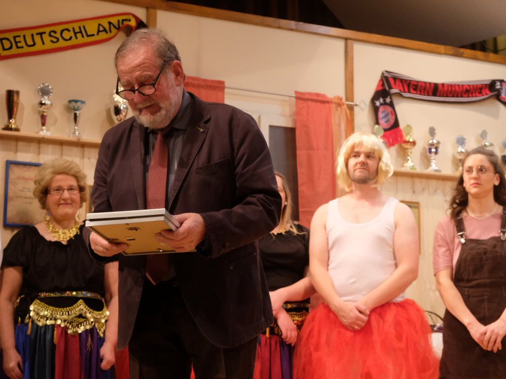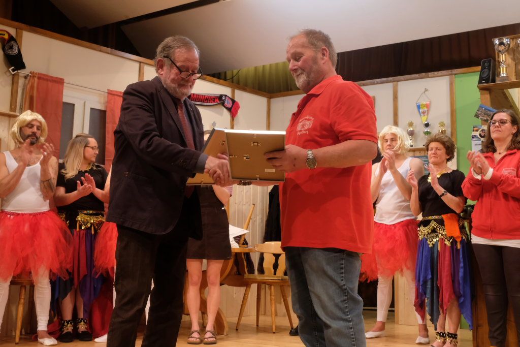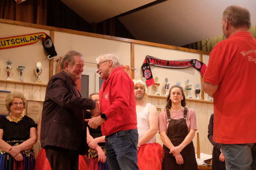 Charly Glaser war es ein Anliegen, mit Ottmar Bendel einen Spezl aus Kindertagen, der als langjährigem Kassier und Organisator des Vereines ihm zur Seite stand, zu danken. Dieser hatte gemeinsam mit ihm beim Theater angefangen. Deswegen war es ihm ein Anliegen, dass dieser ebenfalls in diesem Rahmen geehrt werde, „denn hier sind viele Leute da, bei einer Hauptversammlung vielleicht zwölf.“ Als Zeichen des Dankes überreichte der scheidende Regisseur seinem Kumpel einen Geschenkkorb.