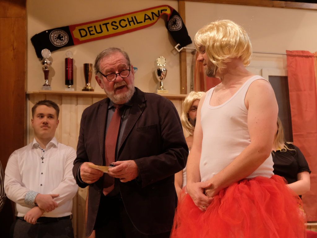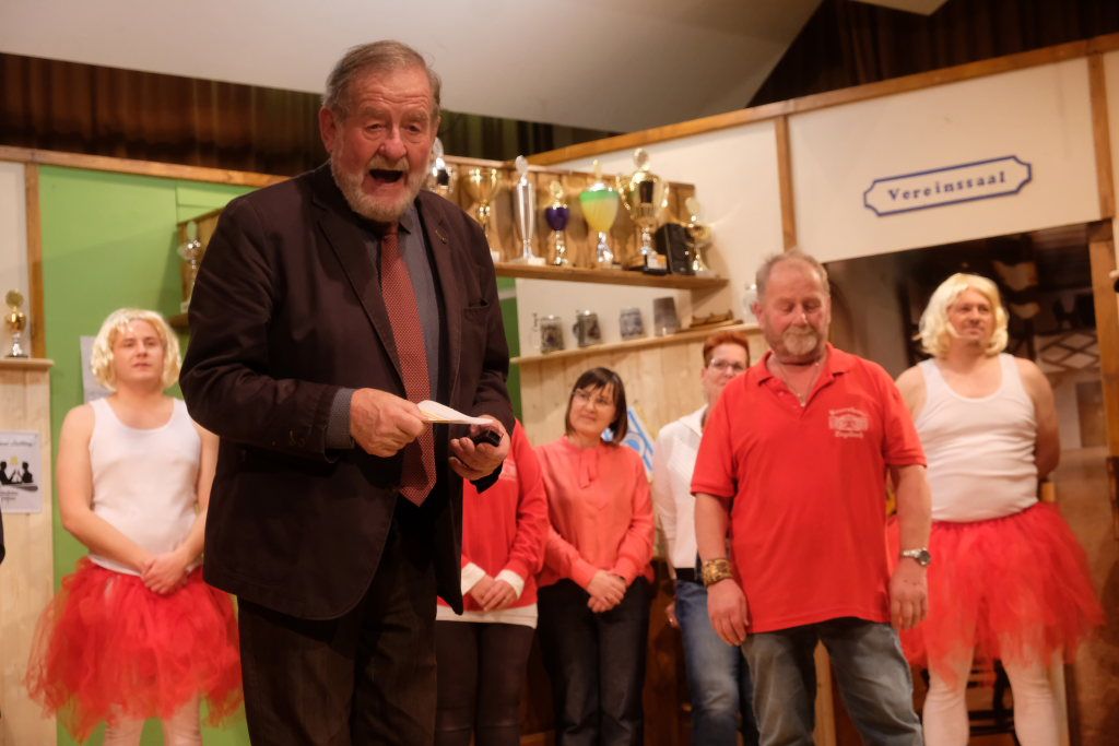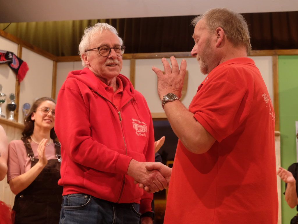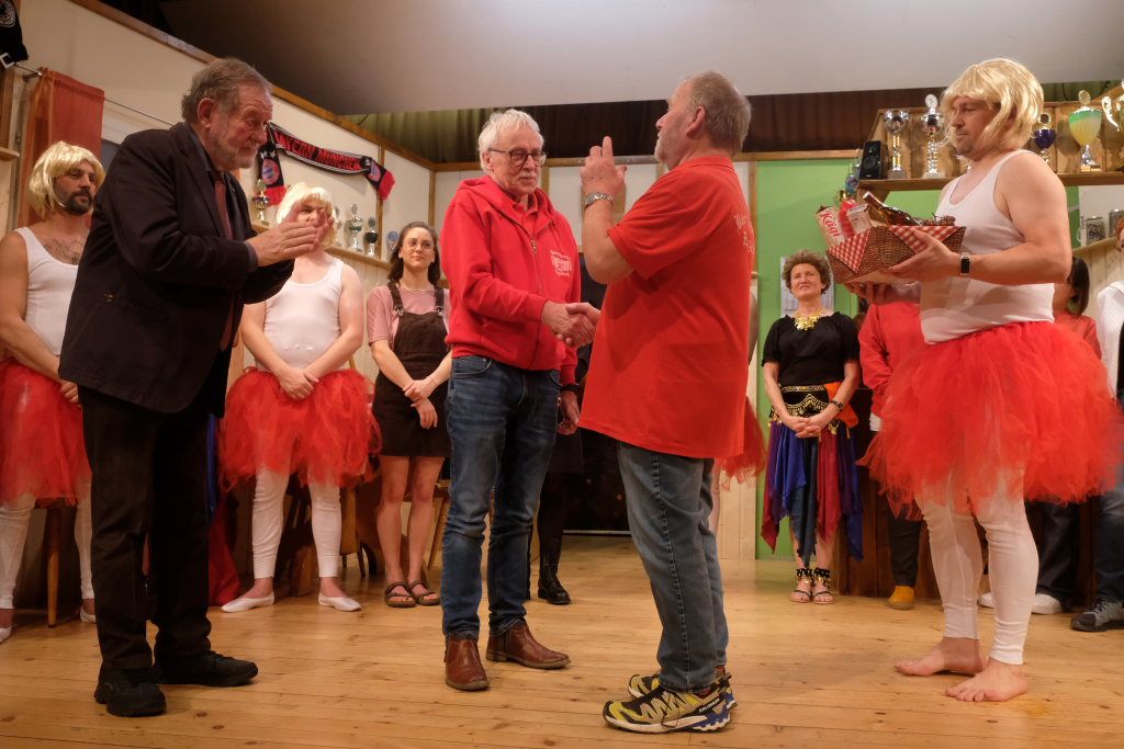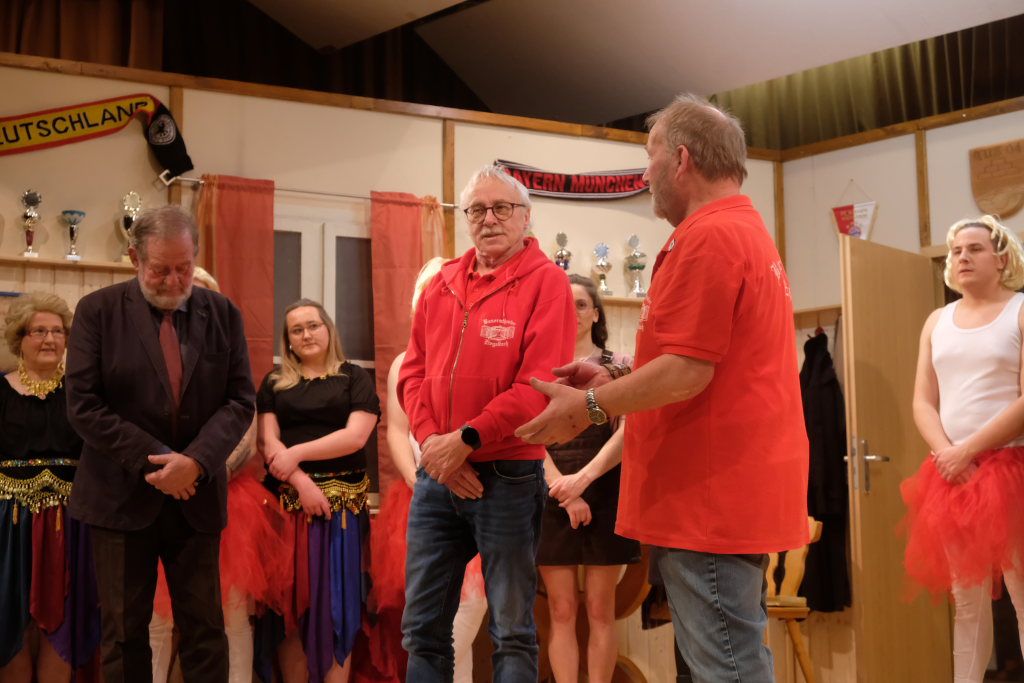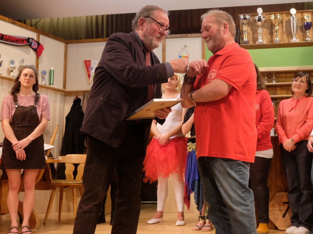 Charly Glaser war es ein Anliegen, mit Ottmar Bendel einen Spezl aus Kindertagen, der als langjährigem Kassier und Organisator des Vereines ihm zur Seite stand, zu danken. Dieser hatte gemeinsam mit ihm beim Theater angefangen. Deswegen war es ihm ein Anliegen, dass dieser ebenfalls in diesem Rahmen geehrt werde, „denn hier sind viele Leute da, bei einer Hauptversammlung vielleicht zwölf.“ Als Zeichen des Dankes überreichte der scheidende Regisseur seinem Kumpel einen Geschenkkorb.