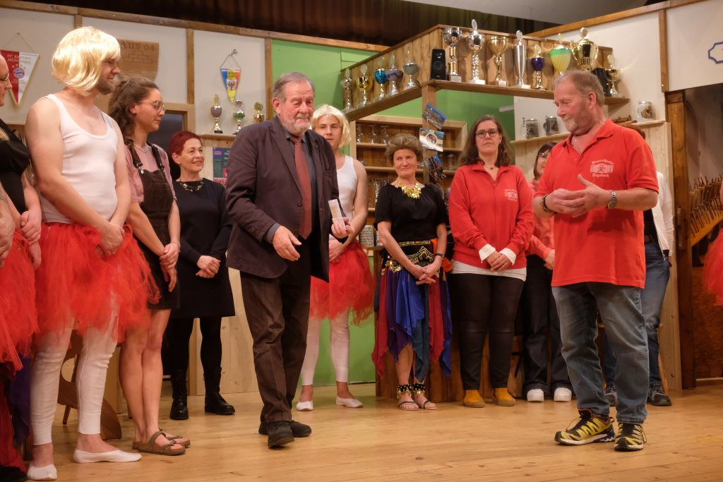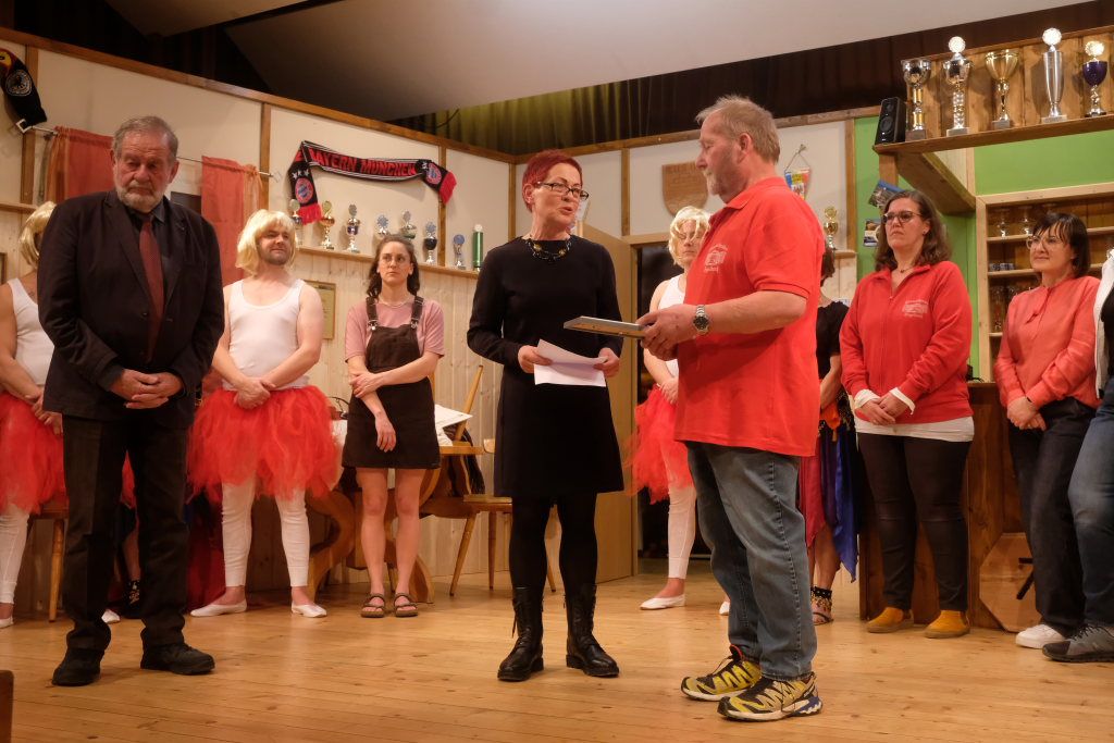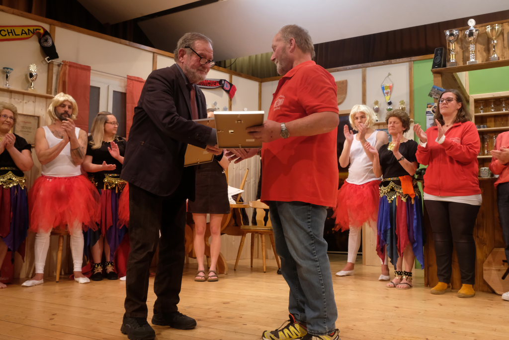Die Laudatio für Charly Glaser hielt – sozusagen als Hausherrin des Dorfstadels – die Ortsvorsteherin Sybille Schleweck. „Theater im ländlichen Raum ist weit mehr als Unterhaltung. Es ist ein Treffpunkt, ein Stück Heimat und ein Ort, an dem Menschen zusammenkommen. Und es lebt von Persönlichkeiten, die bereit sind, Verantwortung zu übernehmen – über viele Jahre hinweg.“ Dass der Ehrenpräsident für die Würdigung dieses Engagements nach Ziegelbach gekommen sei, mache deutlich, dass dieses Engagement über Ziegelbach hinaus wahrgenommen werde. „Das erfüllt uns mit stolz – auf Dich, Charly, und auf das gesamte Bauerntheater.“ Denn für Ziegelbach sei das Theater ein „kulturelles Herzstück“.