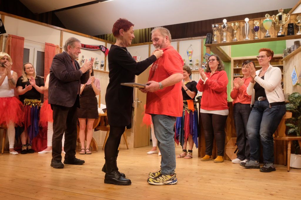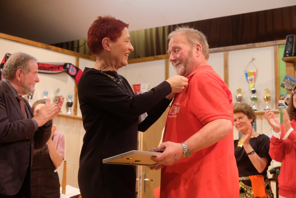 SSybille Schleweck wörtlich: „Lieber Charly, Dein Weg vom Spieler zum Regisseur zeigt, was echtes Ehrenamt bedeutet: mit der Zeit gehen, Verantwortung zu übernehmen und der Sache treu zu bleiben. Du hast unser Bauerntheater über viele Jahrzehnte geprägt – auf der Bühne und jetzt hinter den Kulissen.“ Dafür dankte sie ihm persönlich. Als besondere Auszeichnung überreichte sie ihm das Ziegelbacher Wappen, vergleichbar auf Ortsebene mit der Ehrenmedaille der Stadt.