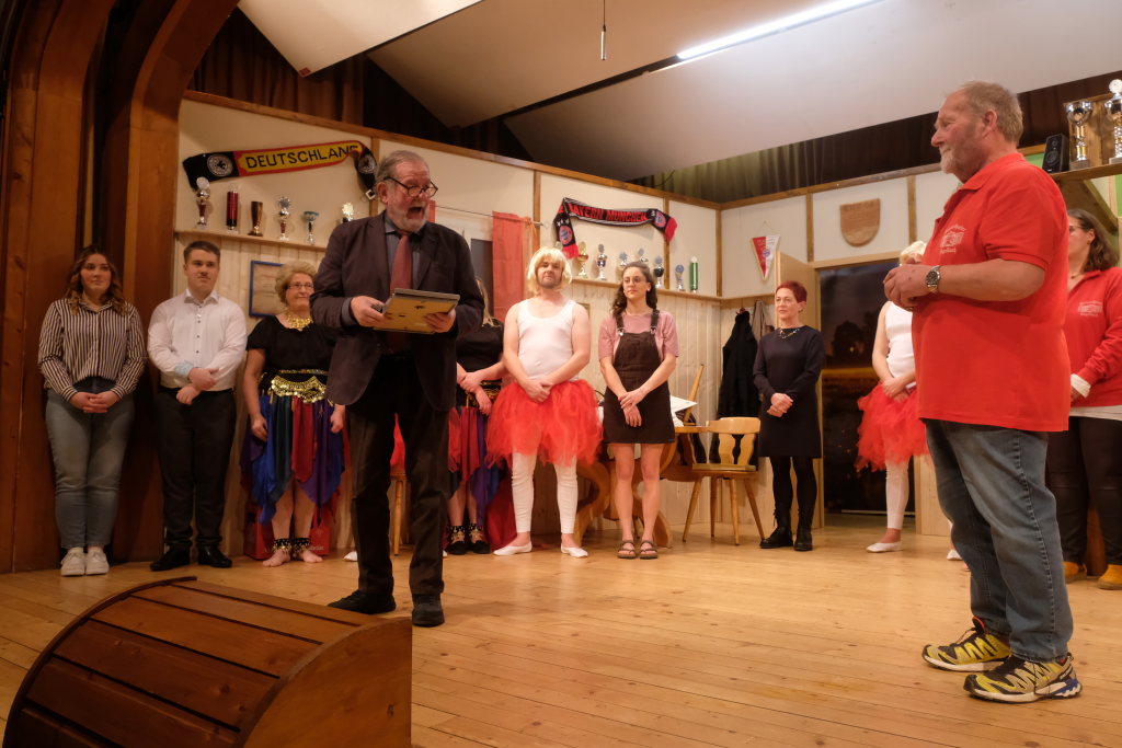 Für diese Ehrungen war der Ehrenpräsident des Landesverbandes Amateurtheater Baden-Württembergs angereist. Aber auch Bürgermeisterin Alexandra Scherer hatte extra ihren Besuch der Vorstellung auf diesen 3. Januar gelegt, um den Geehrten ihre Reverenz zu erweisen. Natürlich nutzte auch Ortsvorsteherin Sybille Schleweck die Gelegenheit, den Geehrten zu gratulieren, aber auch auf der Heimatbühne des Dorfstadels die wichtige Bedeutung des Vereines und dessen Akteure für die Dorfgemeinschaft, das Engagement und die gelebte Heimatkultur hervorzuheben.