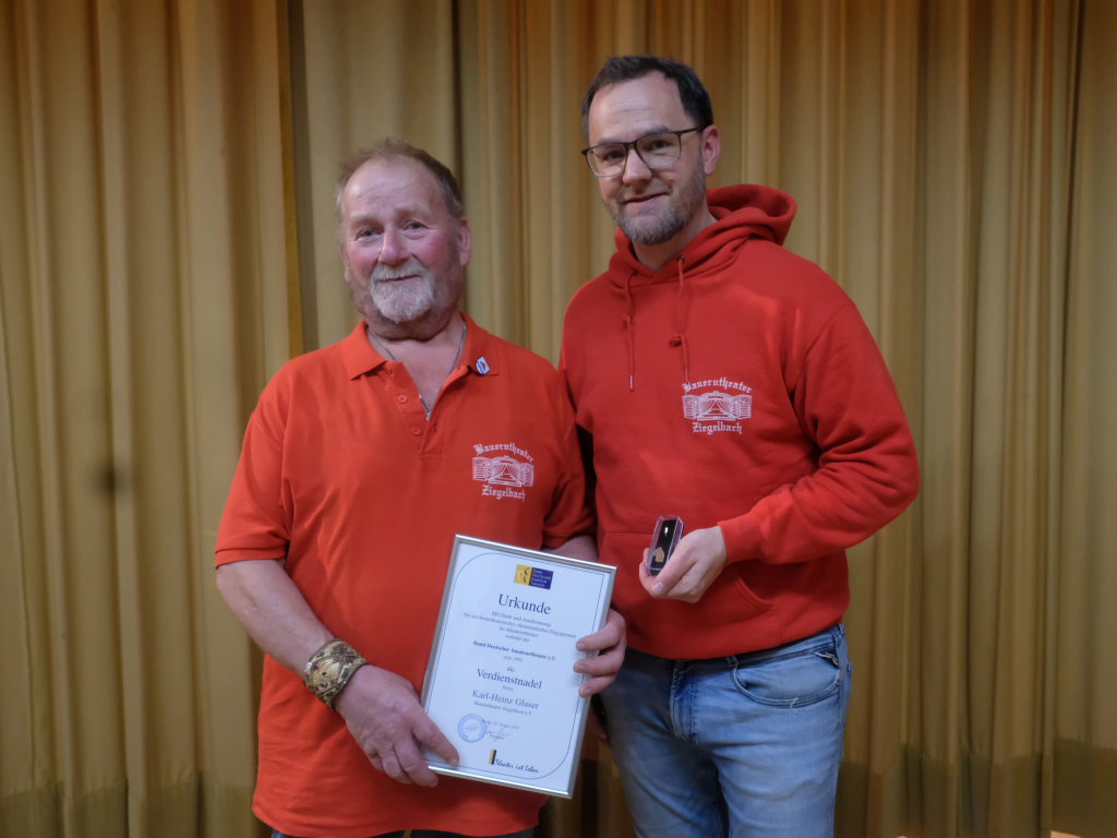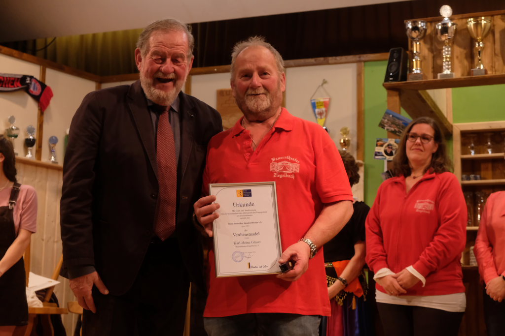 Damit war jedoch die Ehrungswelle noch nicht abgeebbt: Wenhardt hatte noch eine weitere Urkunde im Gepäck, nämlich die für „50 Jahre Bauerntheater Ziegelbach“, die er ebenfalls noch Charly Glaser überreichte.