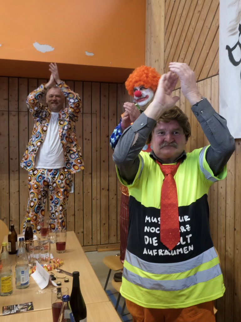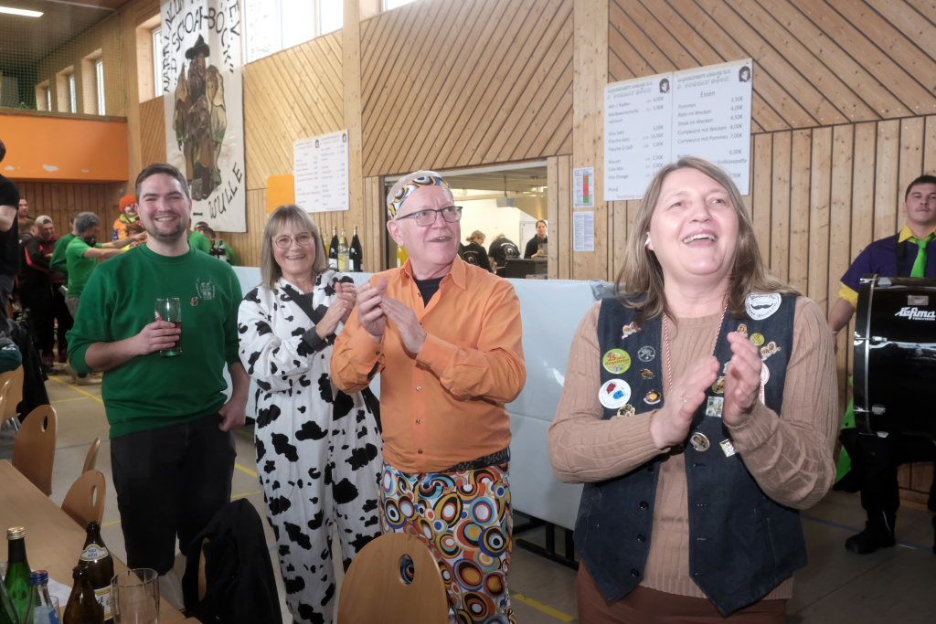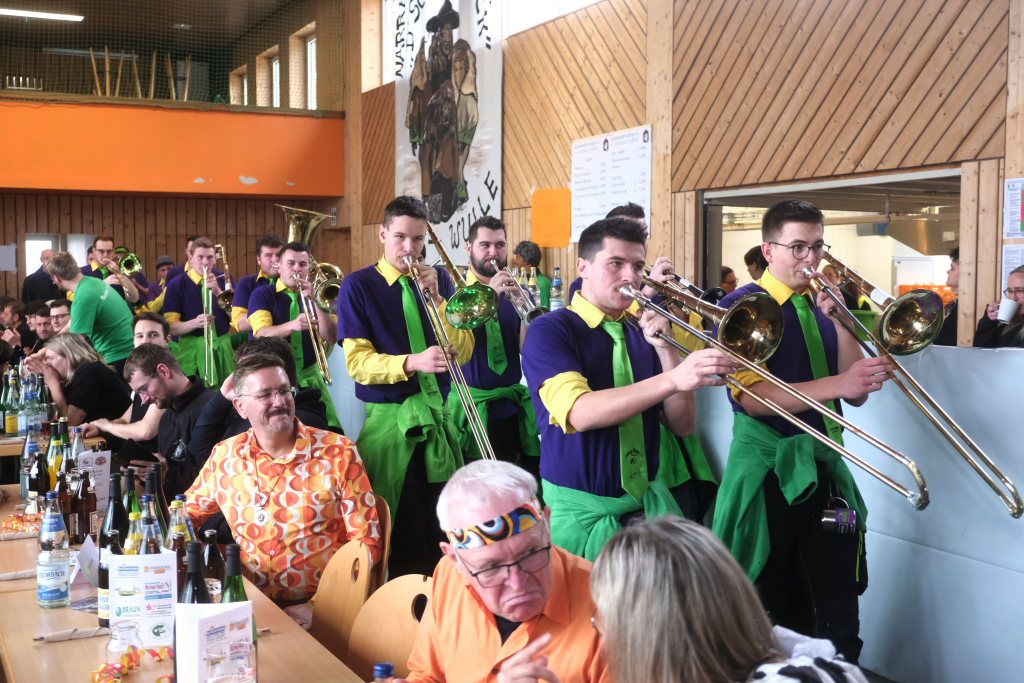 Was natürlich sofort die Seibranzer Allzweckwaffe, sprich den singenden Zunftmeister der Langjuppen, Willi, „Willi Bu“ Butscher auf den Plan rief: Ganz schnell wurde umdisponiert und so wurde mit der ganzen Halle geschmettert: „Lieschen, Lieschen komm ein bisschen…“ und danach noch „Die Getränke sind frei“, dessen Melodie verdächtig nach einem Studentenlied von der 1848er Revolution klang. Dass die Getränke an diesem Nachmittag tatsächlich nicht ausgingen, dafür sorgten viele fleißigen Hände des Fest-erprobten Musikvereins Arnach, die ihren Narrensprung-Veranstaltern helfend unter die Arme griffen.