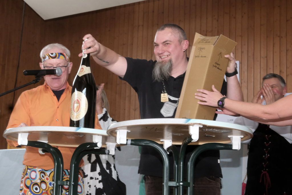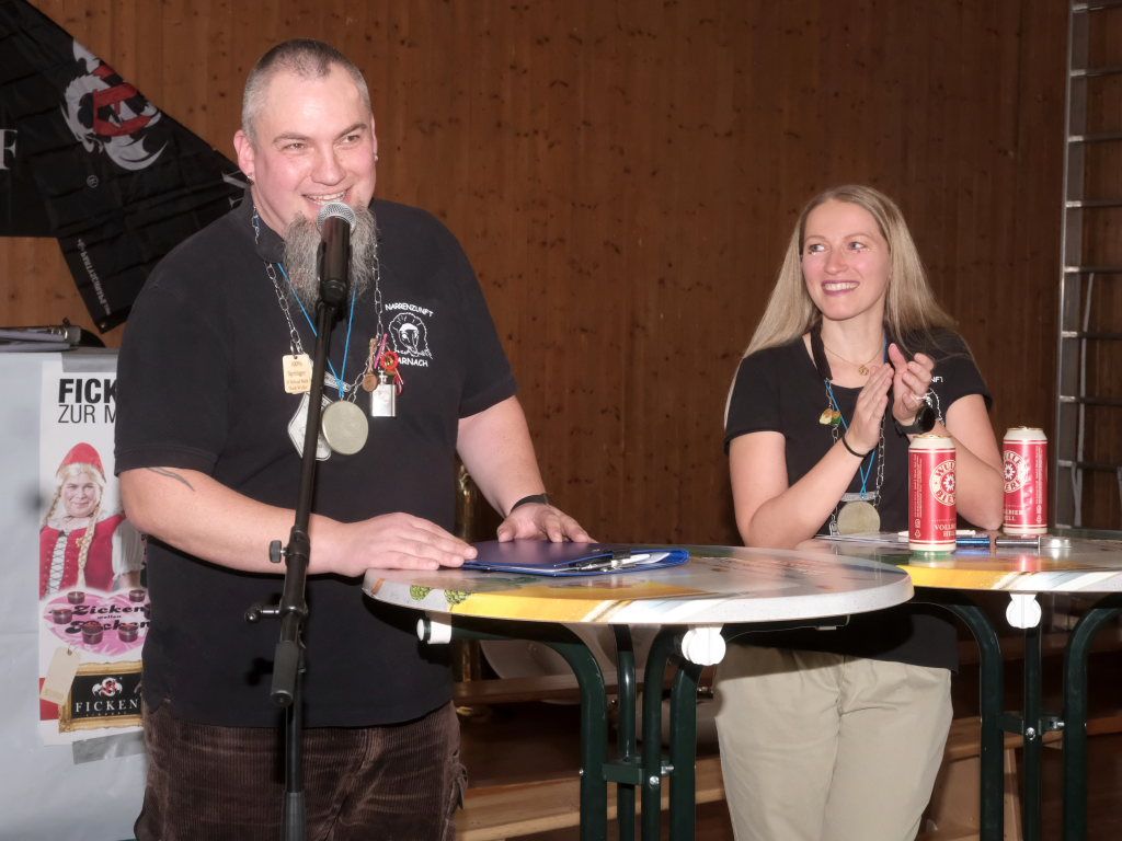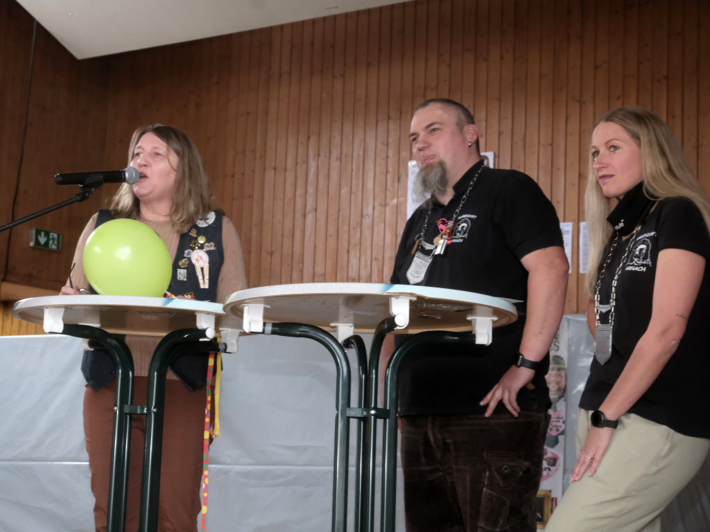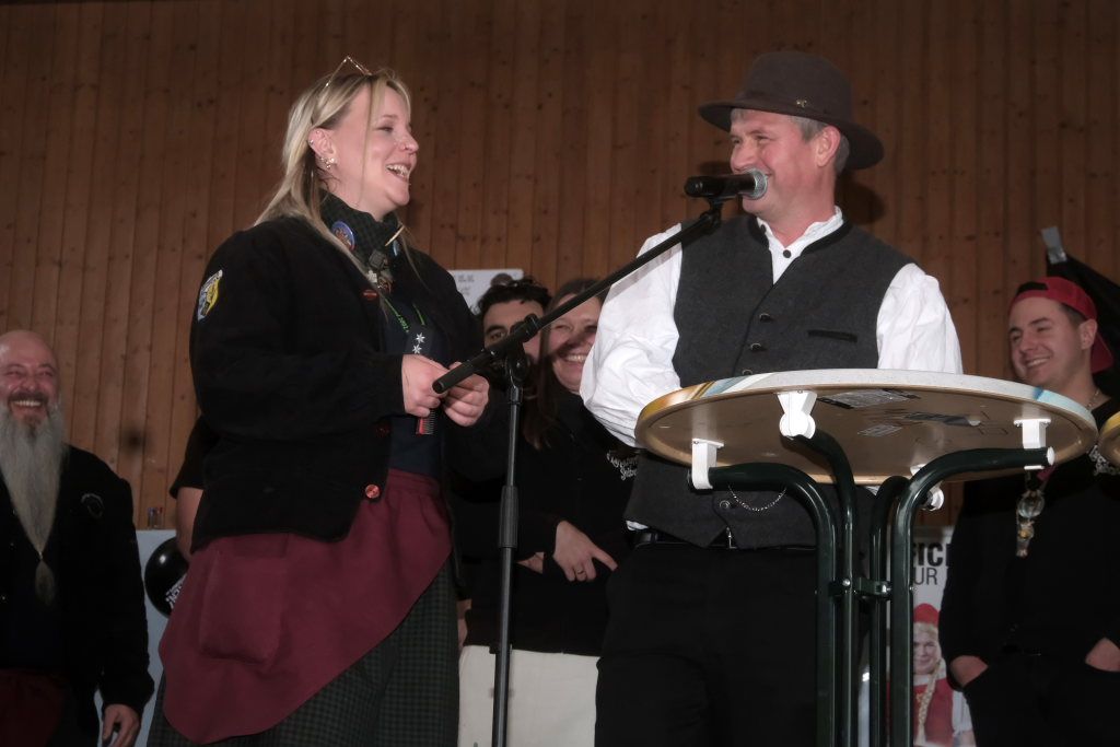 Musikalisch eröffnet wurde dieser dritte Zunftmeisterempfang durch die Allgaier Long Dongs, ehe Kowalewski gemeinsam mit seiner Vizezunftmeisterin Nathalie Koschmieder mit Bürgermeisterin Alexandra Scherer und Ortsvorsteher Manfred Braun samt Ortschaftsrat die Politprominenz auf die Bühne bat, um ihnen den obligatorischen Sprung-Pin ans Narrenkleid anzustecken. Beide grüßten die Narren und insbesondere „Kowa“ Kowalewski in Reimform. Während die Bürgermeisterin als Gastgeschenk den üblichen Vereinszuschuss mitgebracht hatte, hatten Manne Braun und sein Ortschaftsrat neben einer Dreiliter-Bierflasche einer Allgäuer Brauerei noch eine Geldspende des Ortschaftsrates mitgebracht. Denn die Arnacher Narren spenden anstelle von Gastgeschenken in diesem Jahr an das Tierheim Karbach.