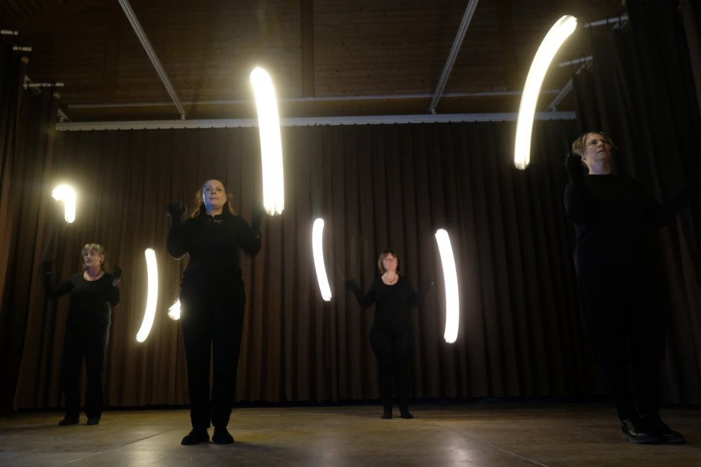Mit einer vor allem etwas fürs Auge bietenden Tanzshow der Zunftfrauen stiegen diese in den zweiten Programmteil ein. In der völlig abgedunkelten Halle schwangen Petra Rösch, Sonja Wassner, Sybille Zupfer und Marietta Etz beinahe wie die Profis „Leuchtkugeln“ und zeichneten damit beeindruckende Leuchtspuren in das Dunkel der Bühne.