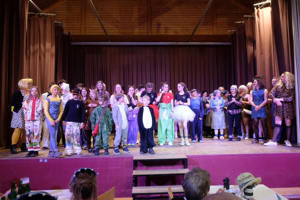 Mit der Auflösung des Narrenrätsels und der Ziehung der drei Gewinner mit Iris Kohler und Sohn Lennard steuerte der diesjährige Ball auf das Finale zu, zu dem sich noch einmal alle Beteiligten auf der Bühne versammelten. Zunftmeister Daniel Wassner nutzte dies, um allen für die riesige erbrachte Leistung in den Jubiläumswochen zu danken. „Ihr seid ein Supertruppe.“