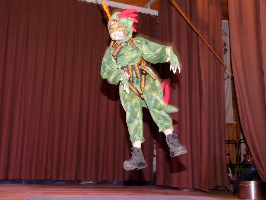 Nach dem Einsprung der Masken Chadaloh, Hugibold, Pebo, Wolfsleib und Wago mit der Zunftfahne unter den Klängen der Musikkapelle Haidgau, die den Haidgauer Narrenmarsch intonierten und der Begrüßung durch Zunftmeister Daniel Wassner mit einem dreifachen Wieso-Awaa legte der Zunftnachwuchs mit seinen Kinderhelden los. Da gaben sich auf der Bühne Bambi, Klopfer und Stinker, die Gummibärenbande, aber auch die Minions, Asterix mit Idefix und natürlich Obelix sozusagen die Klinke in die Hand. Am beeindruckensten aber war die Interpretation des kleinen Drachen Tabaluga, der tatsächlich eine kleine Flugeinlage über der Bühne bot.