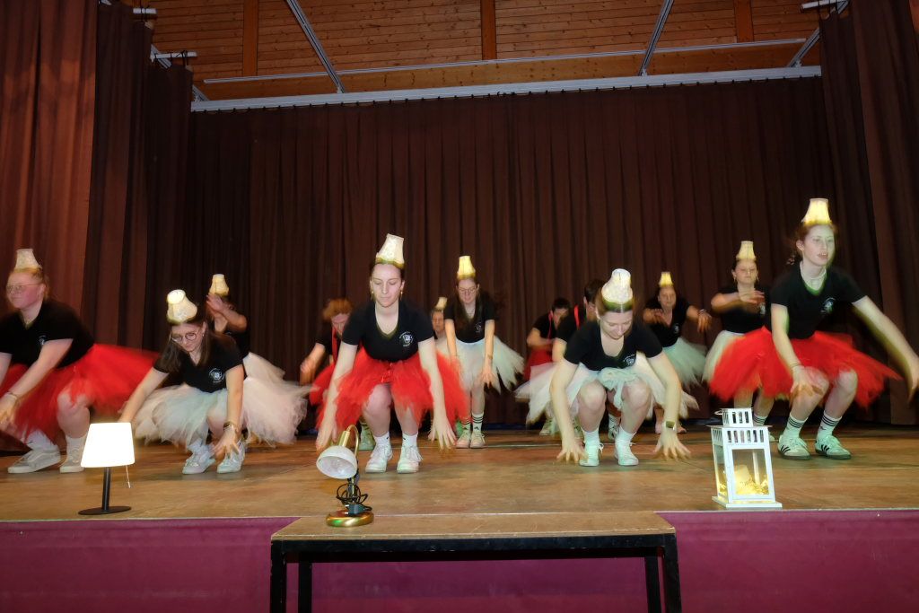 Alle Altersgruppen der Chadaloh sind tänzerisch fit. Die gemischte Gruppe der jungen Erwachsenen bewies dies bei ihrem Tanz zum Fasnetshit des Jahres „Wackelkontakt“. „Wär ich ein Möbelstück, dann wär ich eine Lampe aus den 70ern“. Das Lied wurde von den Tänzerinnen und Tänzern hervorragend interpretiert, vor allem trugen sie selbst jeweils eine funktionierende stylische Lampe aus dieser Epoche auf dem Kopf.