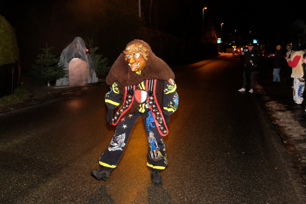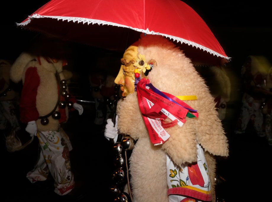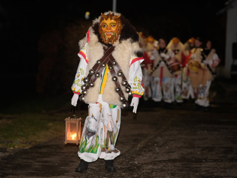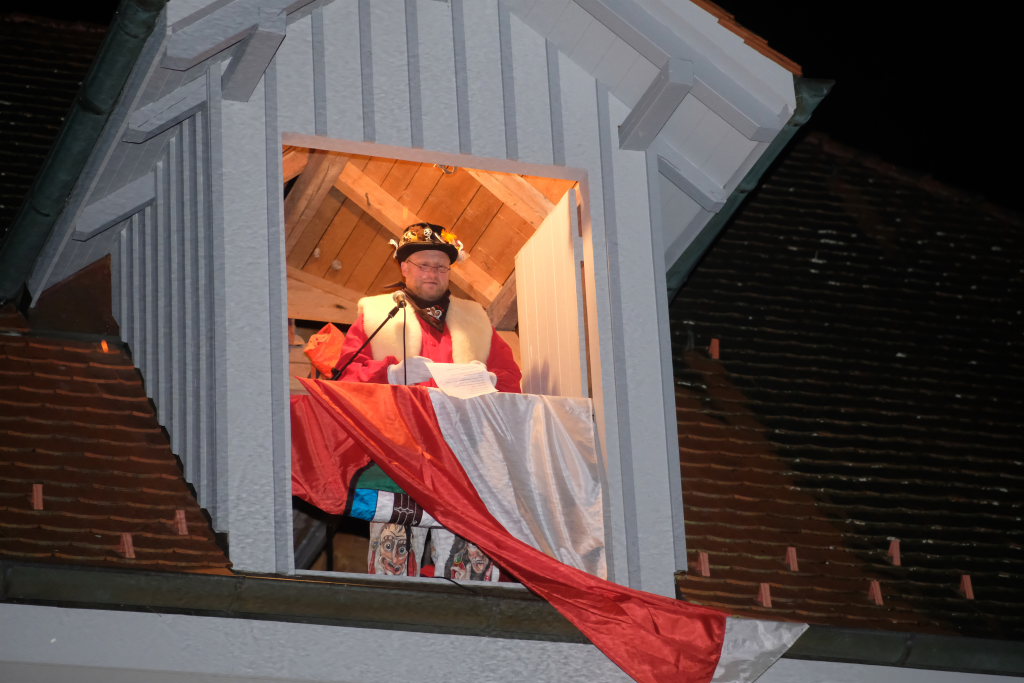 Von – künstlichem – Nebel umwabert stieg der Schwarznarr „Wolfsleib“, von „Wago“ geweckt, der mit seiner Laterne als Erster die Szene betrat, aus seiner Höhle gegenüber des Rathauses. Gemeinsam machten sie sich auf die Suche nach den anderen Narren, die dann von allen Seiten zu ihrem närrischen Treiben zum Haidgauer Rathausplatz strömten. Dort wartete bereits die Schalmeiengruppe D`Hoigamer Schtroßahup`r, die musikalisch – u. a. mit dem Haidgauer Narrenmarsch – die Fasnet miteinläutete. Mit dem alljährlichen von Zunftmeister Daniel Wassner vom Bühnenlädele des Rathauses herabgesprochenen Zaubersatz: „Etz, Ihr Narra, springet zua, und hollet`n raus den Schwanz von dr Kuh!“ wurden die 327 Tage gemeinsam mit den Masken und Häsern in den Truhen ruhenden namensgebenden Accessoires zum kräftigen Auslüften hervorgeholt.
