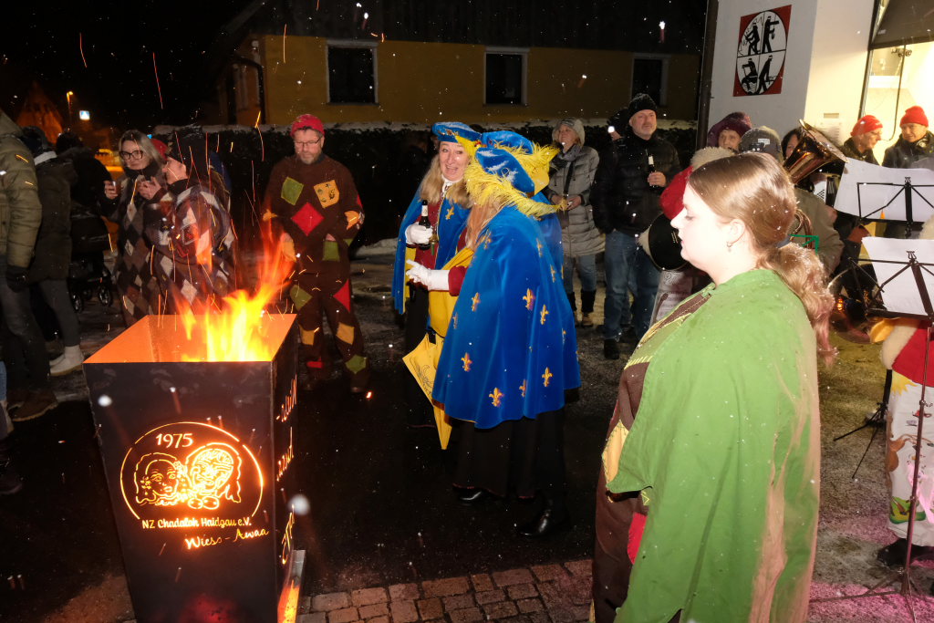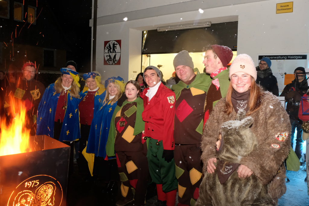 Und während die Hästräger auf der Straße zur Musik der Hoigamer Fasnetsmusi tanzten, scharten sich die Besucher bei den eisigen Temperaturen gerne um die neue – natürlich mit den Haidgauer Masken verzierte – Jubiläums-Feuerschale.