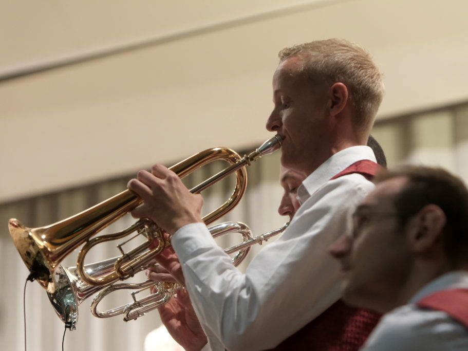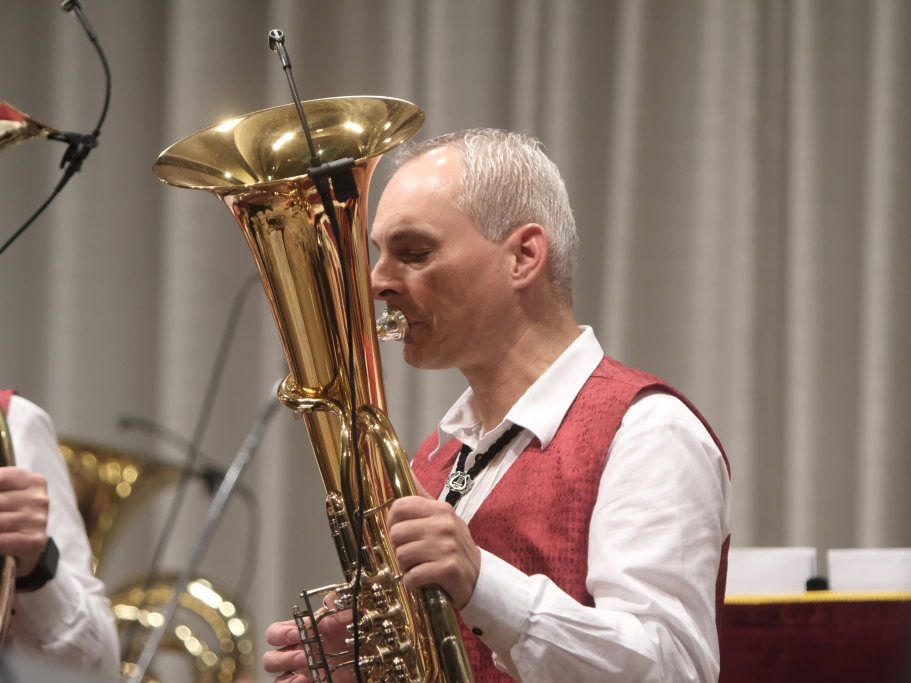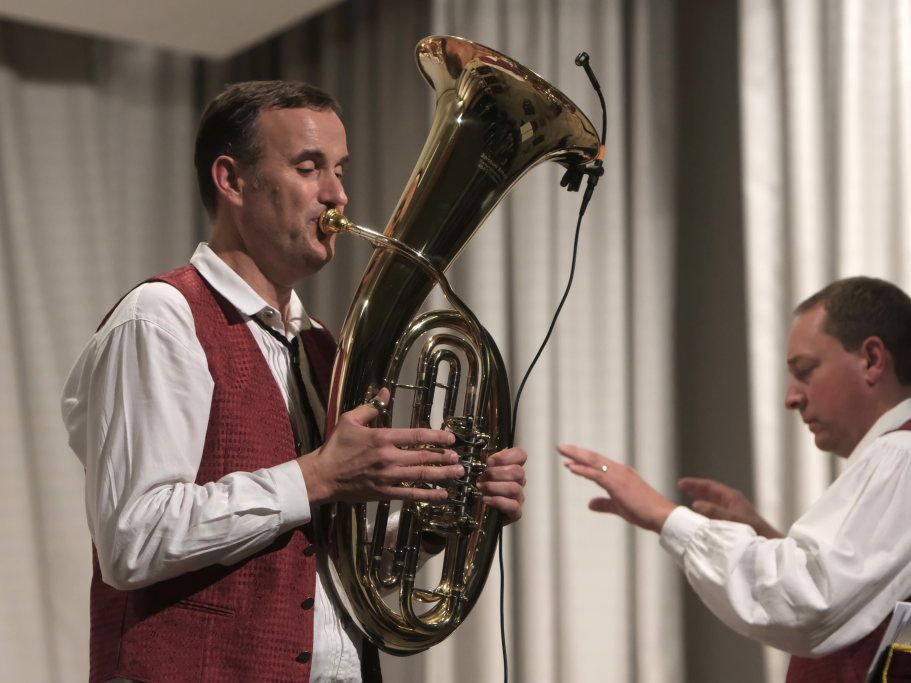„Der alte Dessauer“ und Markus Elsers´ virtuose Interpretation gehört einfach zum Standardprogramm der Oberschwäbischen Dorfmusikanten. Mucksmäuschenstill war es im Kursaal, während Elses Soli, aber um so frenetischer fiel danach der Applaus des Publikums aus. Mit der von Simon Föhr komponierten Risstalpolka ging es danach in die Pause. Ein weiterer Solist ist Klaus Merk, der mit seinem Tenorhorn bei “Carrickfergus” alle verzauberte.