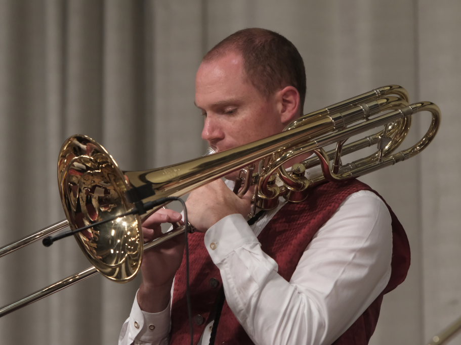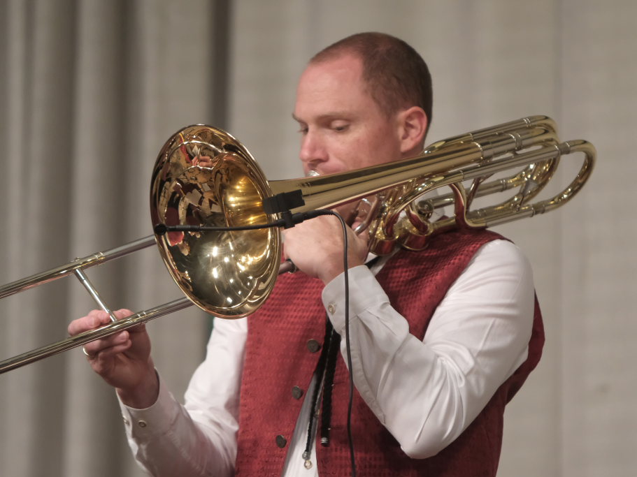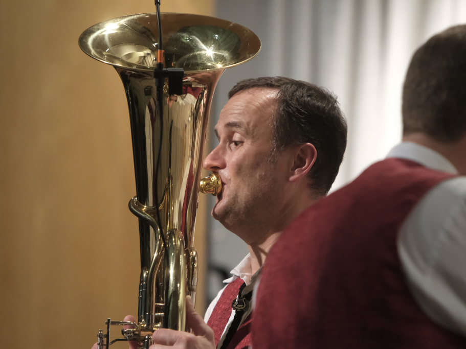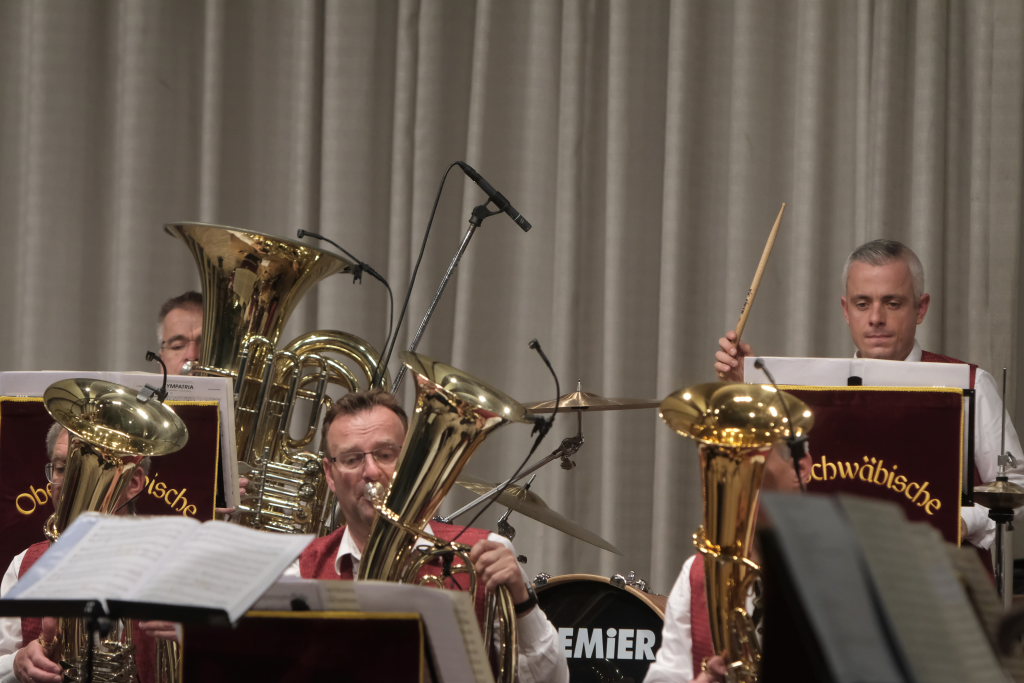 „Der alte Dessauer“ und Markus Elsers´ virtuose Interpretation gehört einfach zum Standardprogramm der Oberschwäbischen Dorfmusikanten. Mucksmäuschenstill war es im Kursaal, während Elses Soli, aber um so frenetischer fiel danach der Applaus des Publikums aus. Mit der von Simon Föhr komponierten Risstalpolka ging es danach in die Pause. Ein weiterer Solist ist Klaus Merk, der mit seinem Tenorhorn bei “Carrickfergus” alle verzauberte.