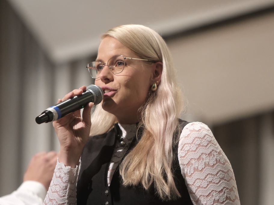 Mit der beliebtesten Polka aus der Feder von Peter Schad mit dem bezeichnenden Titel „Ewig Schad“ waren Musiker und Publikum schon mitten im Konzertmodus. Nach dem Song „The Rose“, der durch Bette Midler seine Popularität erlangte und bei dem Carina Kienle erstmals ihren fantastischen Stimmumfang unter Beweis stellen konnte, war es Zeit für eine Dirigentenvorstellung. Carina erkannte dabei viele Parallellen zu Föhrs Vorgänger Peter Schad. Beide waren Posaunisten, die ihre ersten große Bühnenerfahrungen beim Heeresmusikkorps in Ulm sammelten. Beide studierten Musik auf Lehramt. Föhr ist Studienrat für Mathe und Musik am Gymnasium in Ehingen, als diplomierter Dirigent Leiter der Stadtkapelle Biberach und nebenbei leitet er auch noch einen Männerchor. Nicht fehlen durfte natürlich ein Hinweis auf sein Geburtsjahr 1983, das zufälligerweise gleichzeitig das Gründungsjahr der OSDM ist.