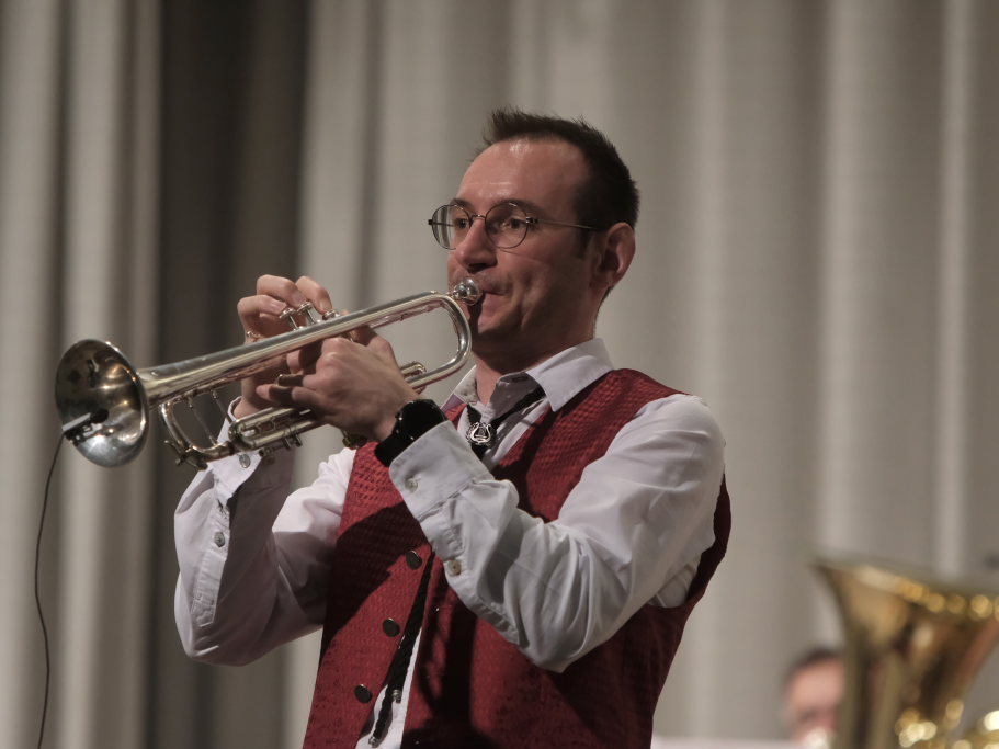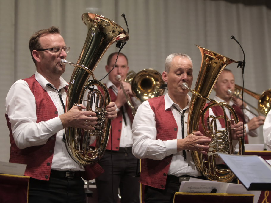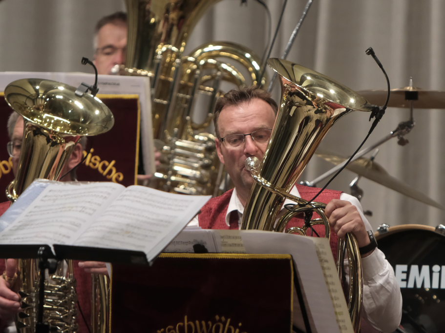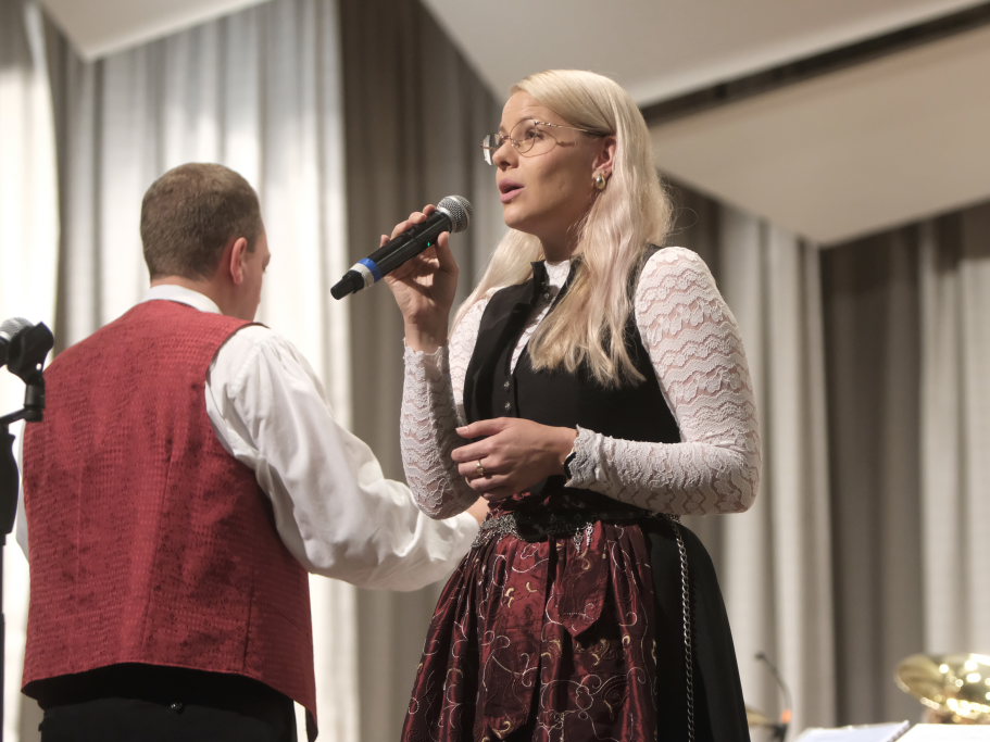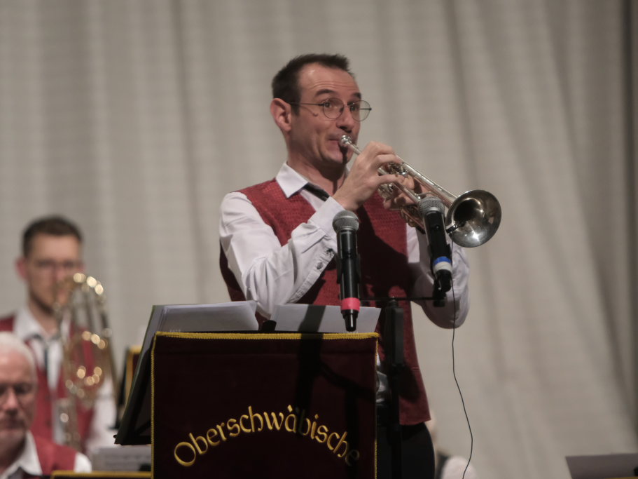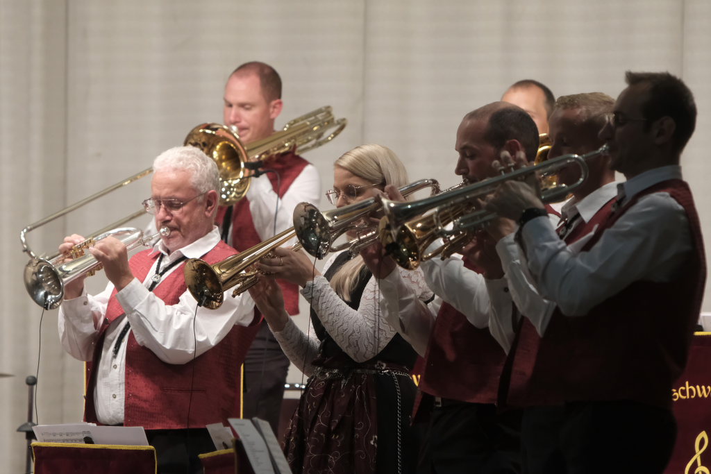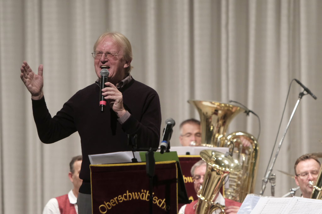 Das Konzert, zu dem sich auch Gäste aus der Schweiz nach Bad Wurzach aufgemacht hatten, eröffneten Simon Föhr und seine Musiker mit dem Konzertmarsch “Sympatria” von Thomas Asanger. Simon Föhr, der ehemalige Posaunist und Sänger der Dorfmusikanten, führte neben seinem Dirigat gemeinsam mit Goldkehlchen Carina Kienle durch das Programm. Für die Sängerin war es ebenfalls wie für den Posaunisten Jürgen Münsch aus Haidgau ein Heimspiel.