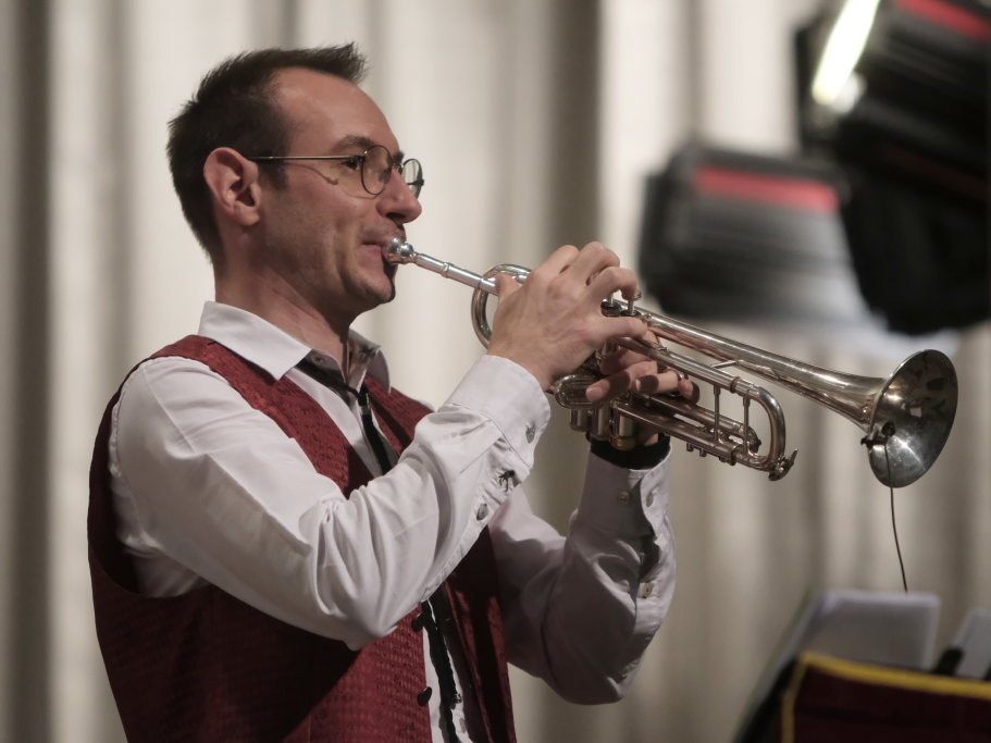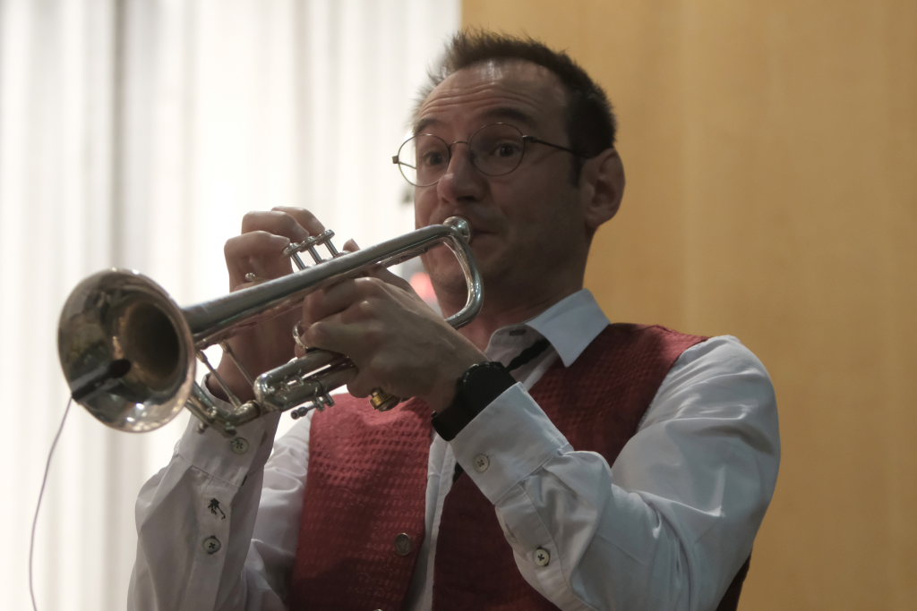 Auch Walzer gehören selbstverständlich zum Oeuvre der Oberschwäbischen Dorfmusikanten ebenso wie das von Chören gern gesungene Lied vom „Bajazzo“. Bei der Ankündigung des Strauß-Walzer „An der schönen blauen Donau“ bat Föhr das Publikum, seine Phantasie schweifen zu lassen und sich ihn als Karajan und seine OSDM als Wiener Philharmoniker vorzustellen.