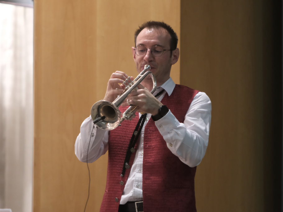 Nach dem wunderschönen „Frühlingswalzer“ und der Polka „Jubiläumsklänge“ aus der Feder von Peter Schad, letztere schrieb er zum Zehnjährigen der OSDM, war es Zeit für einen Witz. Simon Föhr berichtete von einem mysteriösen Todesfall auf der Schultreppe. Die herbeigerufene Kripo in Person des Hauptkommissars Michael Kuhn (Flügelhornist der OSDM) kam dabei bei der Festlegung des Tatortes ins Schleudern: „Gymn.., Gimnas..). „Bringen wir sie rüber und schreiben einfach Post.“