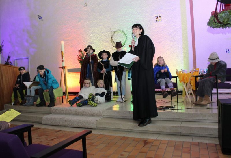 Unter dem Titel „Die tollste Geschichte der Welt“ agierten sie überaus souverän, konnten ihre Texte auswendig und zeigten schauspielerische Leistungen. Das Team um Böttiger mit Elisabeth Gottschling und Ramona Herrmann hatte wirklich Beachtliches zu Wege gebracht. Es spielten mit: Mia, Sebastian, Kim, Luke und Lukas Gottschling, Julian und Rafael Herrmann, Mattheo Melchiors, Romy Miller, Greta Preuss, Luisa Reisch sowie Henriette, Margarethe und Johanne Böttiger. Neben kritischen Bemerkungen wie, dass auch heutzutage noch Menschen „im Regen stehen gelassen werden“, gab es humorvolle Passagen, die die bis auf den letzten Platz gefüllte Kirche zum Lachen brachten, wie beispielsweise das Wortspiel, dass „das Kind die Grippe bekam“ – „Nein, Unsinn, das Kind wurde in eine Krippe gelegt. Also in so einen Futtertrog mit Stroh für die Tiere.“
