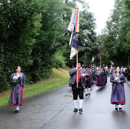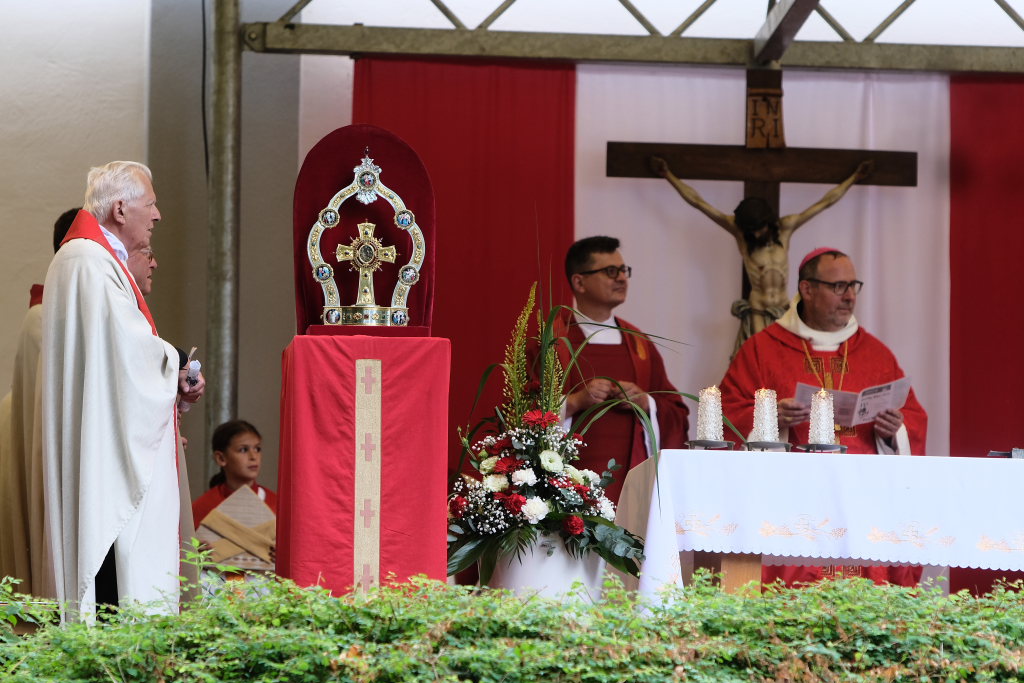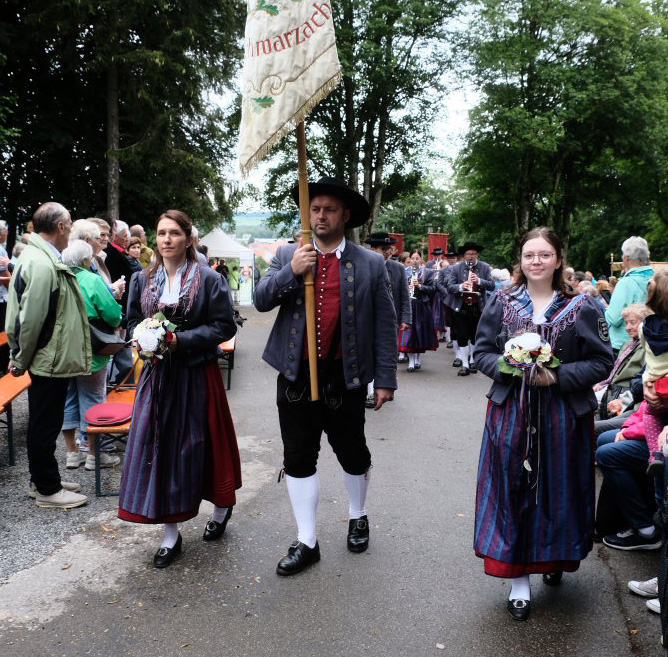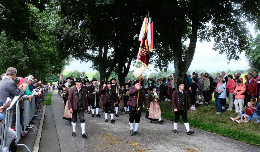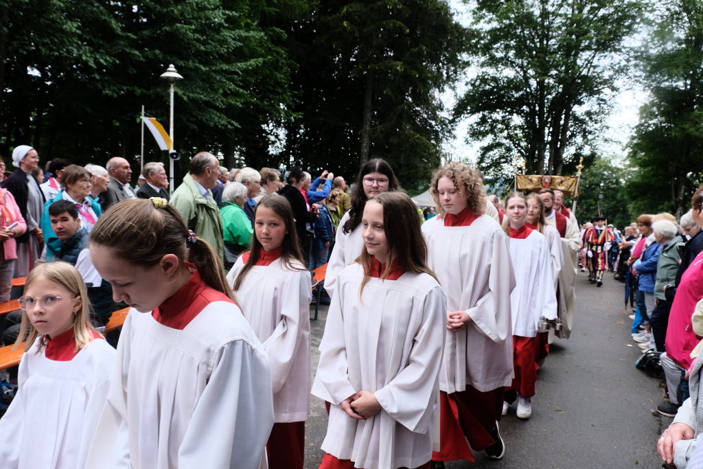 Die Musikkapelle Unterschwarzach geleitete den Festzug mit der Reliquienmonstranz vom Podest an der Straße hinauf zum Baldachin vor der Gottesberg-Kirche, wo dann die Stadtkapelle unter der bewährten Leitung von Petra Springer die weitere musikalische Begleitung des Gottesdienstes übernahm.
