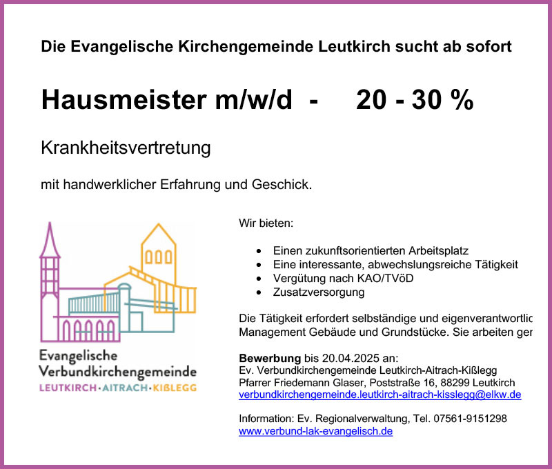 Bad Wurzach – Die Stadt Bad Wurzach beschäftigt sich aktuell mit dem Bedarf an Kindergarten- und Krippenplätzen für Bad Wurzacher Kinder im kommenden Kindergarten- und Krippenjahr. Eltern, deren Kinder ab September 2026 ein Jahr (für die Kinderkrippe) bzw. zwei Jahre und älter (für den Kindergarten) sind und in diesem Zeitraum einen Kindergarten- oder Krippenplatz belegen möchten, sollten sich deshalb im Kindergarten bzw. in der Krippe ihrer Wahl melden. Unter „Downloads“ haben wir ein zweise…