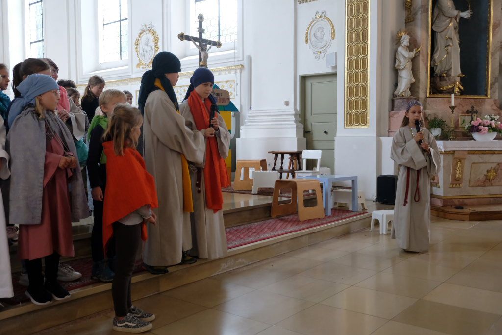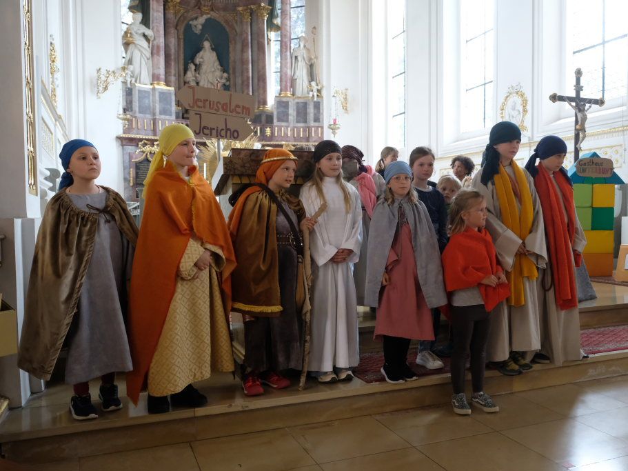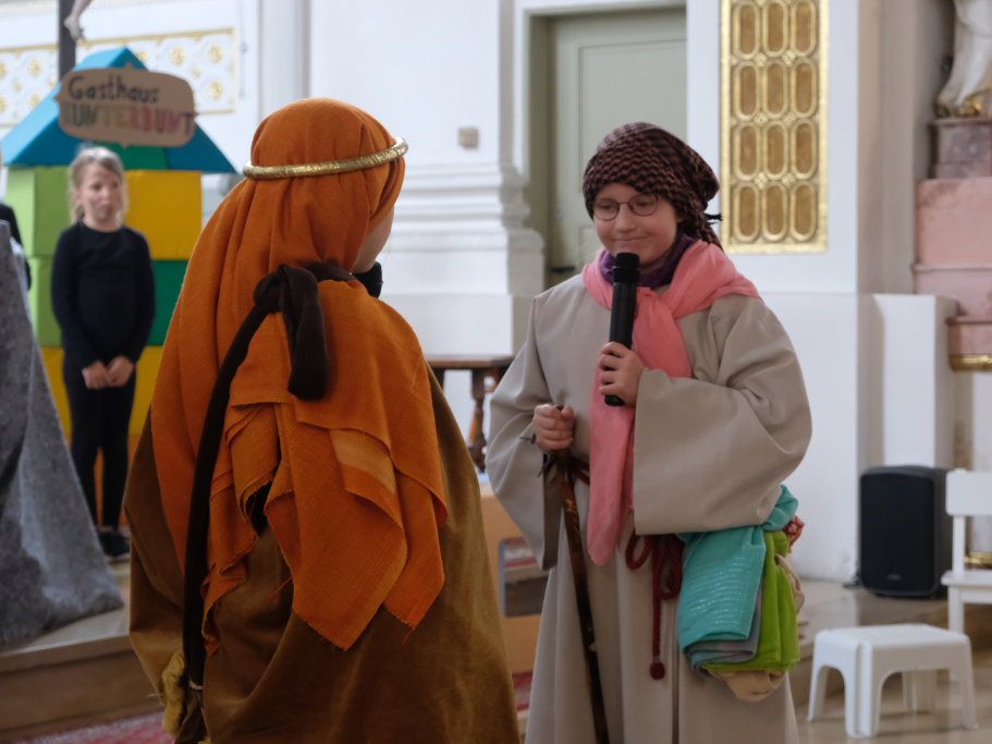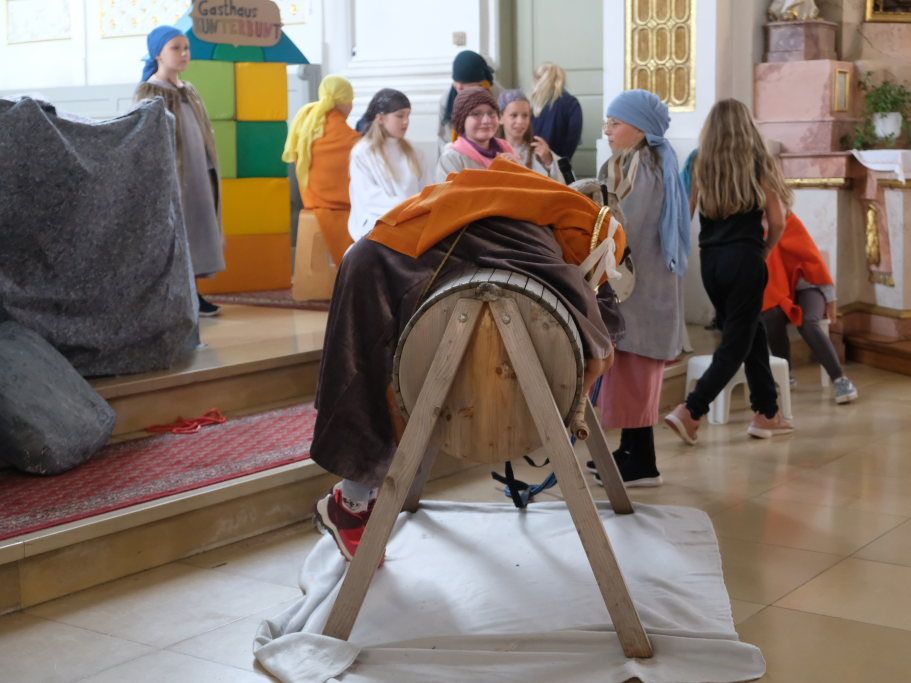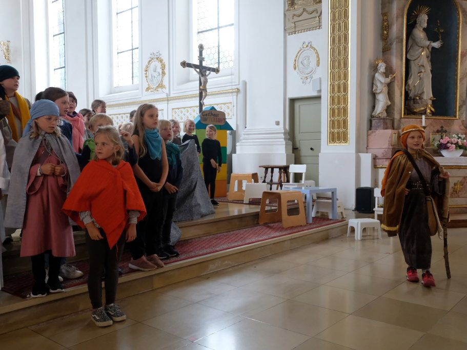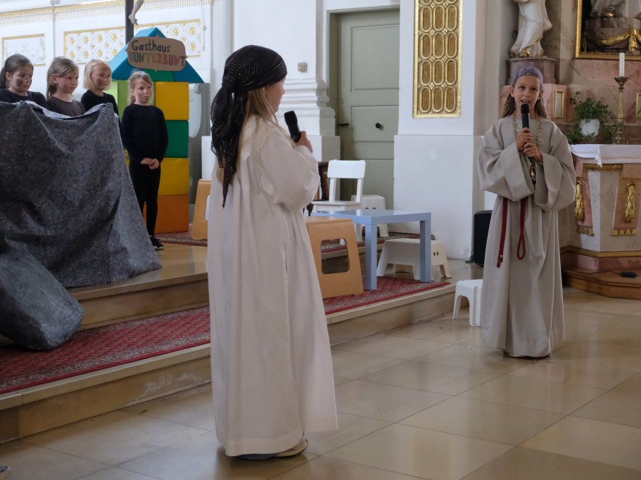 Das erste Mal spielten sie es vor zahlreichen Eltern, Verwandten und Freuden nach dem Festgottesdienst. Die Musikalische Leitung hatte Bernadette Vogt inne, die die Lieder am Piano begleitete. Regie führte Bernadette Miller, die den kleinen Akteuren jeweils die nächste Szene anzeigte. Ausgestattet mit einem liebevoll gestalteten Bühnenbild, fantasievollen Gewändern und einer mitreissenden Musik zeigten die Kinder mit dem Gleichnis vom barmherzigen Samariter, wie topaktuell die Thematik – Gleichgültigkeit gegenüber seinen Mitmenschen und Skepsis gegenüber allem Fremden – auch heute nach 2.000 Jahren noch oder wieder ist.