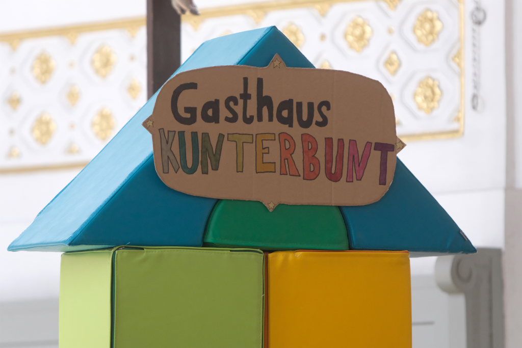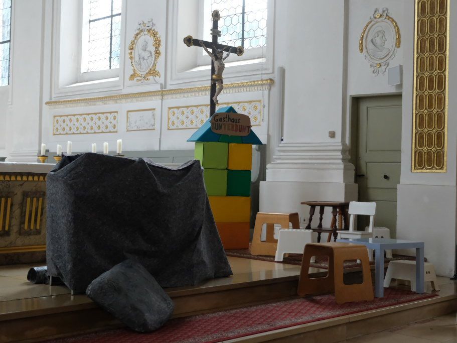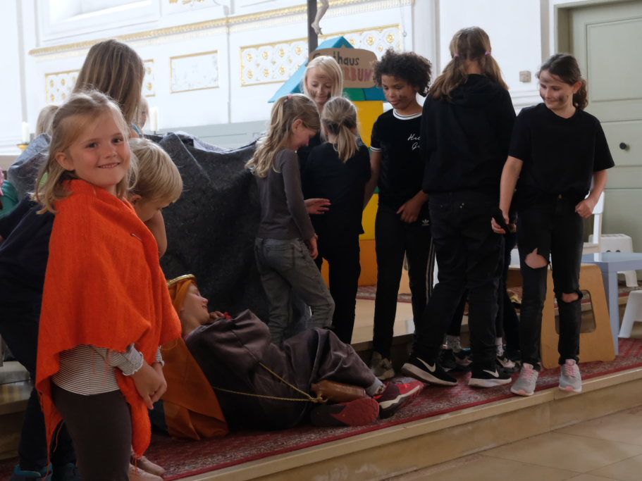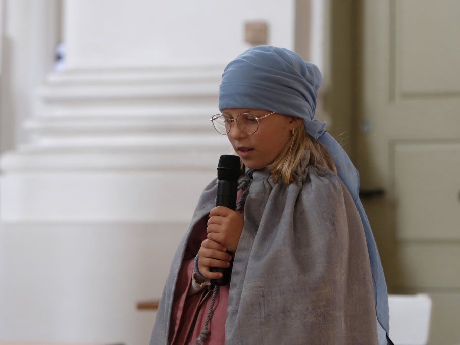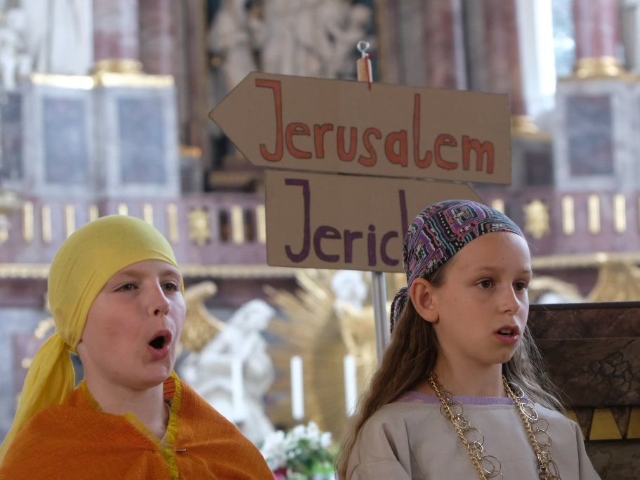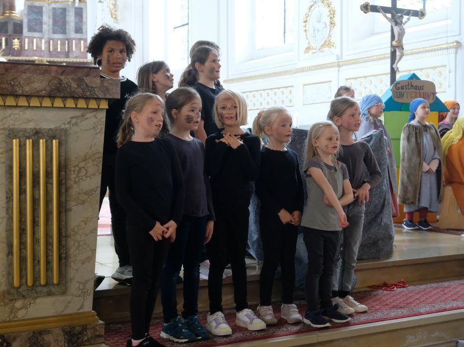Das erste Mal spielten sie es vor zahlreichen Eltern, Verwandten und Freuden nach dem Festgottesdienst. Die Musikalische Leitung hatte Bernadette Vogt inne, die die Lieder am Piano begleitete. Regie führte Bernadette Miller, die den kleinen Akteuren jeweils die nächste Szene anzeigte. Ausgestattet mit einem liebevoll gestalteten Bühnenbild, fantasievollen Gewändern und einer mitreissenden Musik zeigten die Kinder mit dem Gleichnis vom barmherzigen Samariter, wie topaktuell die Thematik – Gleichgültigkeit gegenüber seinen Mitmenschen und Skepsis gegenüber allem Fremden – auch heute nach 2.000 Jahren noch oder wieder ist.