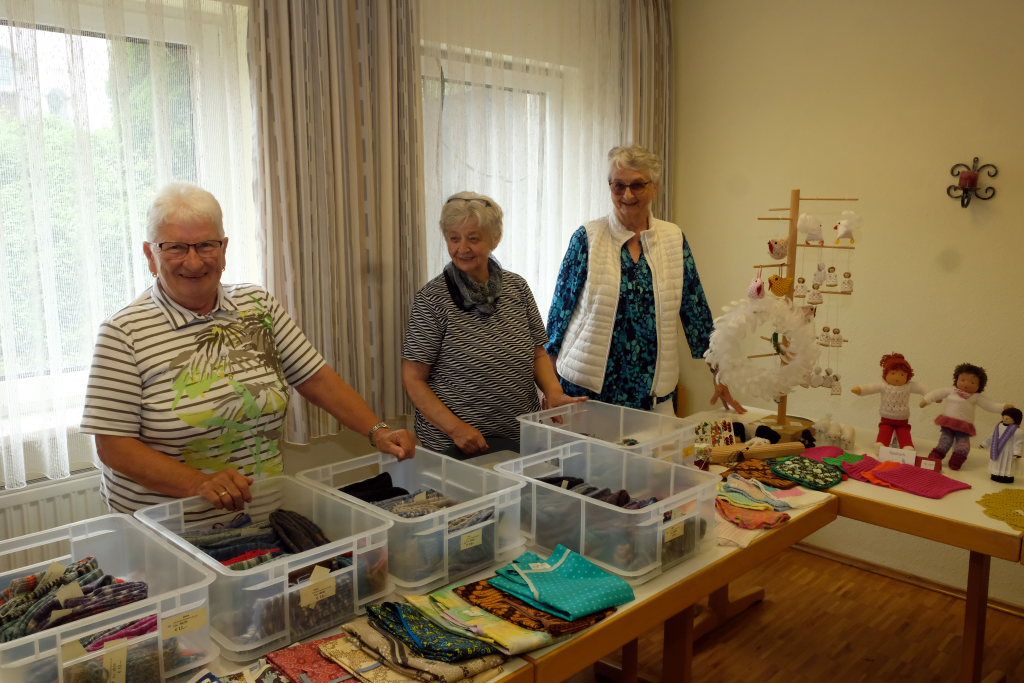 Für die Caritas-Frauen war es wieder sehr komfortabel: Sie konnten ihre feilgebotenen Sachen direkt am Ort des Entstehens im Untergeschoss des Pius Scheel Hauses präsentieren. Das lästige Ein- bzw. Ausräumen entfiel für sie daher. Vor allem Socken und weitere Strickwaren bildeten das Grundsortiment ihres Angebotes.