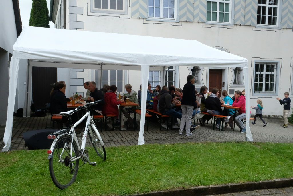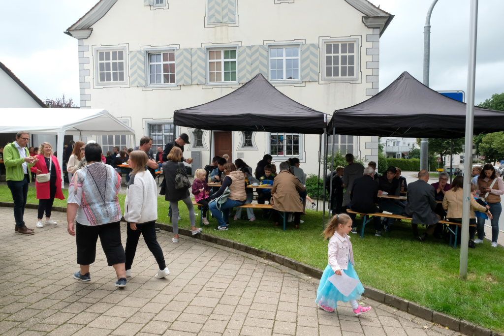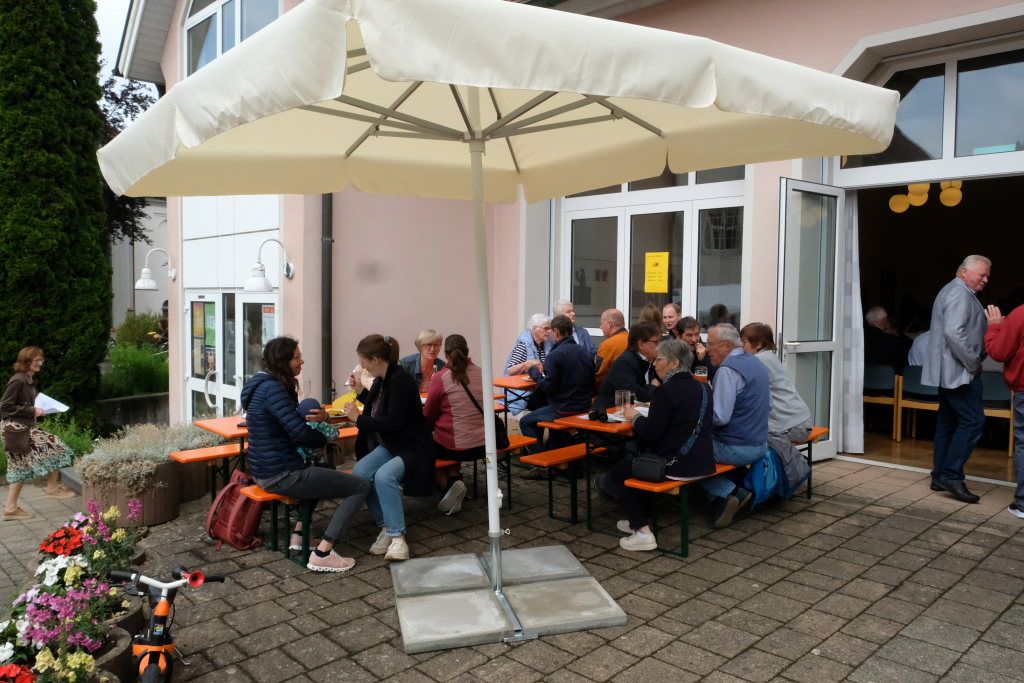Wie bereits im Vorjahr fand das Fest direkt im und am Pius-Scheel-Haus statt. Bierbänke und -tische boten angenehme Sitzgelegenheiten und Baldachine sorgten für die nötige Beschattung. Viele freiwillige Helfer aus den Reihen des Kirchenchores, aber auch viele ehemaligen Sängerinnen und Sänger des Jugendchores sorgten dafür, dass die Gäste zeitnah zu ihrem Essen und ihren Getränken kamen. Es gab an der Selbstbedienungstheke im Saal leckeren Grillbraten und Kartoffelsalat, beim Grillmobil vor dem Haus gab es Steak, die berühmte Grillwurst und Pommes.