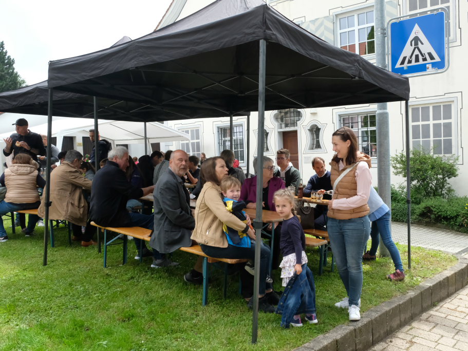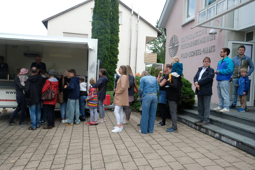 Wie bereits im Vorjahr fand das Fest direkt im und am Pius-Scheel-Haus statt. Bierbänke und -tische boten angenehme Sitzgelegenheiten und Baldachine sorgten für die nötige Beschattung. Viele freiwillige Helfer aus den Reihen des Kirchenchores, aber auch viele ehemaligen Sängerinnen und Sänger des Jugendchores sorgten dafür, dass die Gäste zeitnah zu ihrem Essen und ihren Getränken kamen. Es gab an der Selbstbedienungstheke im Saal leckeren Grillbraten und Kartoffelsalat, beim Grillmobil vor dem Haus gab es Steak, die berühmte Grillwurst und Pommes.