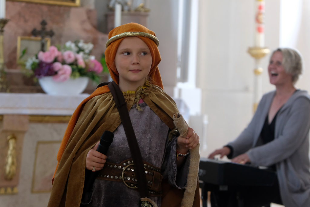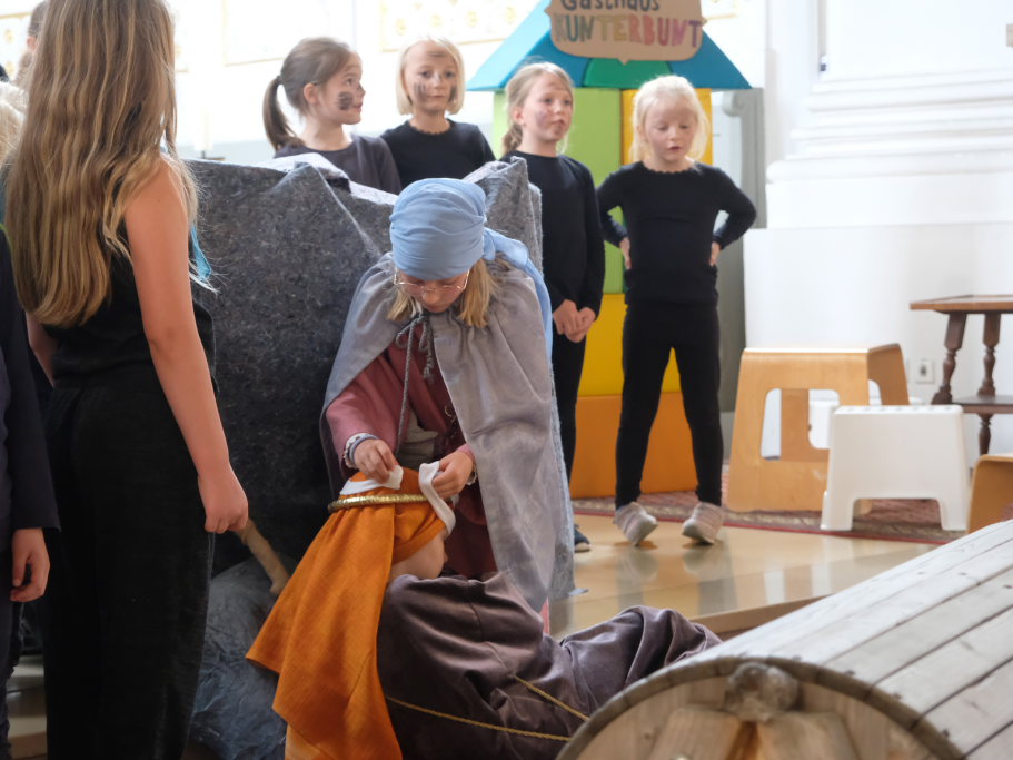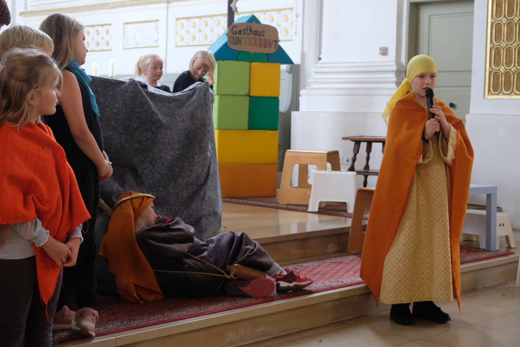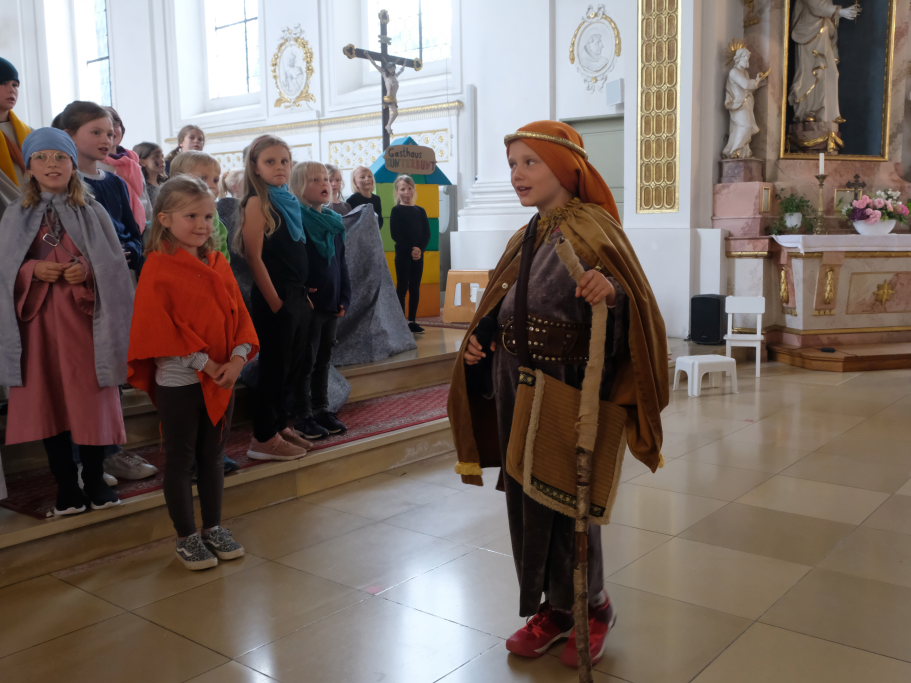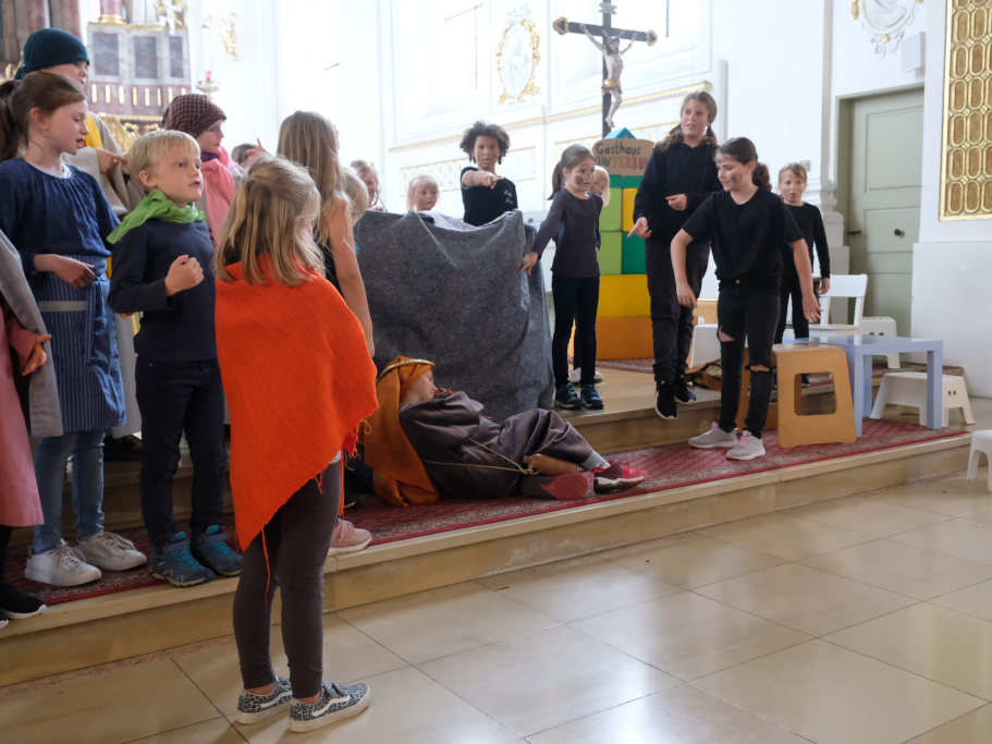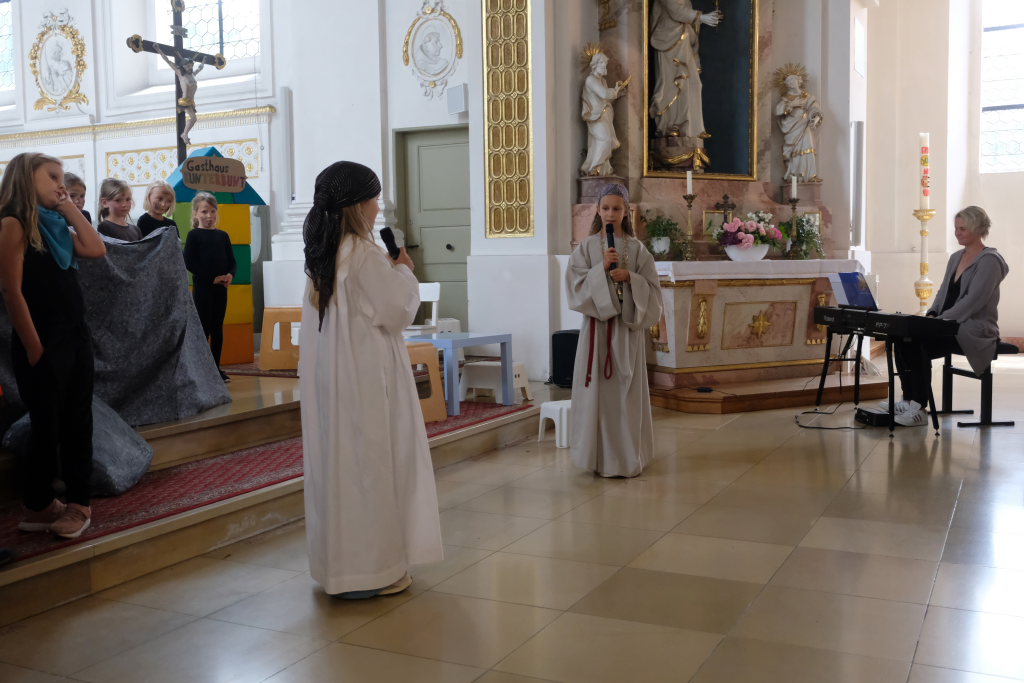 Das erste Mal spielten sie es vor zahlreichen Eltern, Verwandten und Freuden nach dem Festgottesdienst. Die Musikalische Leitung hatte Bernadette Vogt inne, die die Lieder am Piano begleitete. Regie führte Bernadette Miller, die den kleinen Akteuren jeweils die nächste Szene anzeigte. Ausgestattet mit einem liebevoll gestalteten Bühnenbild, fantasievollen Gewändern und einer mitreissenden Musik zeigten die Kinder mit dem Gleichnis vom barmherzigen Samariter, wie topaktuell die Thematik – Gleichgültigkeit gegenüber seinen Mitmenschen und Skepsis gegenüber allem Fremden – auch heute nach 2.000 Jahren noch oder wieder ist.