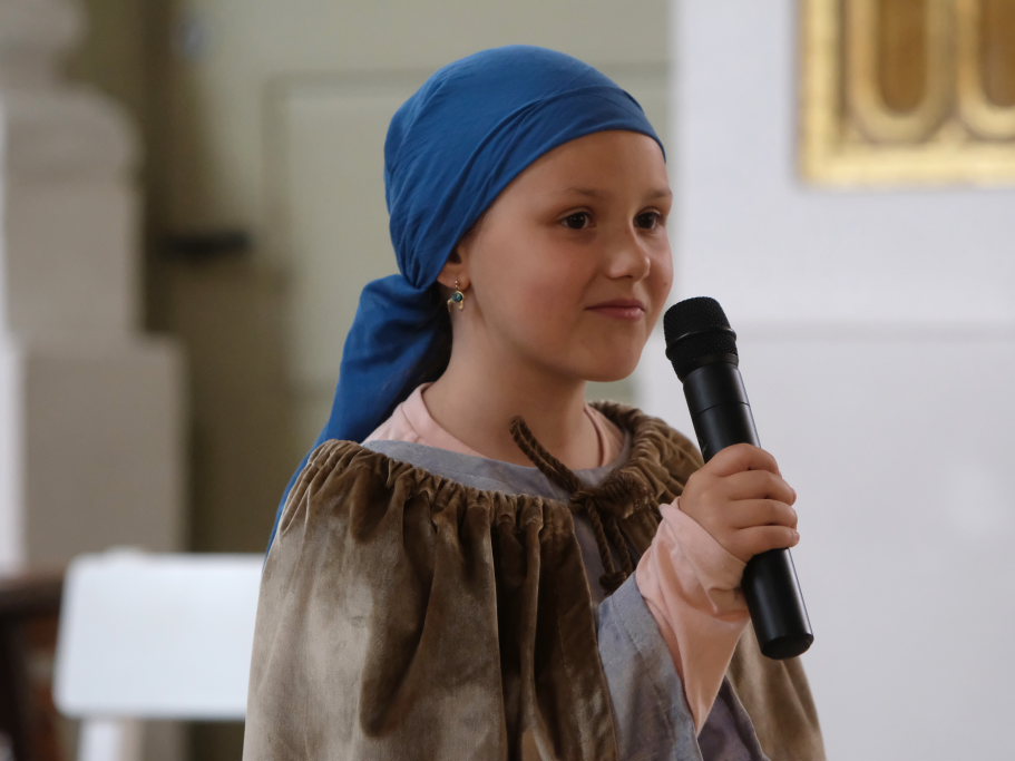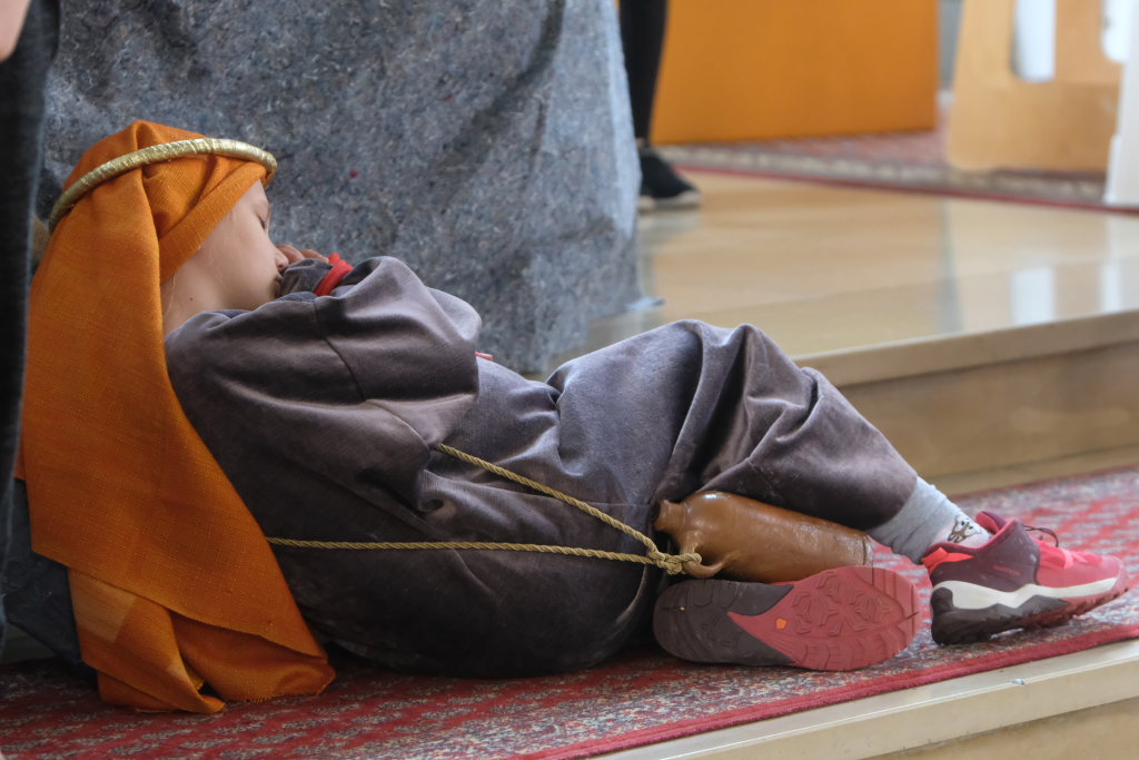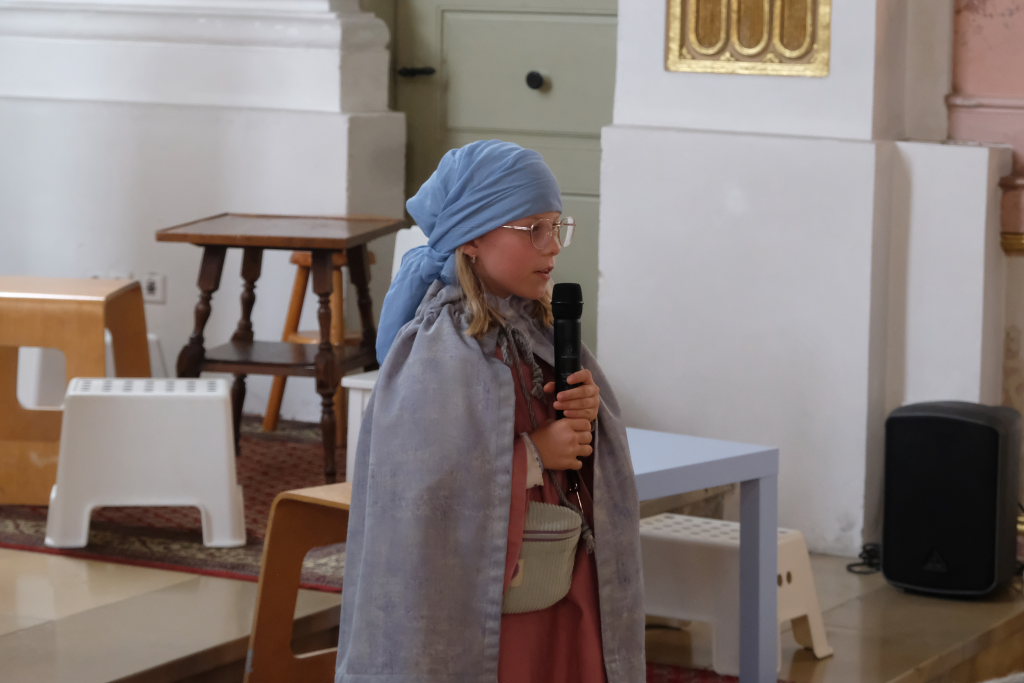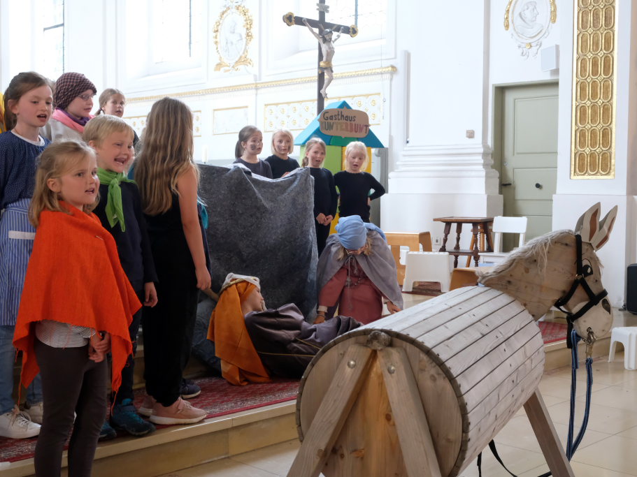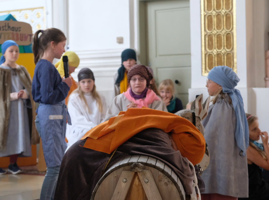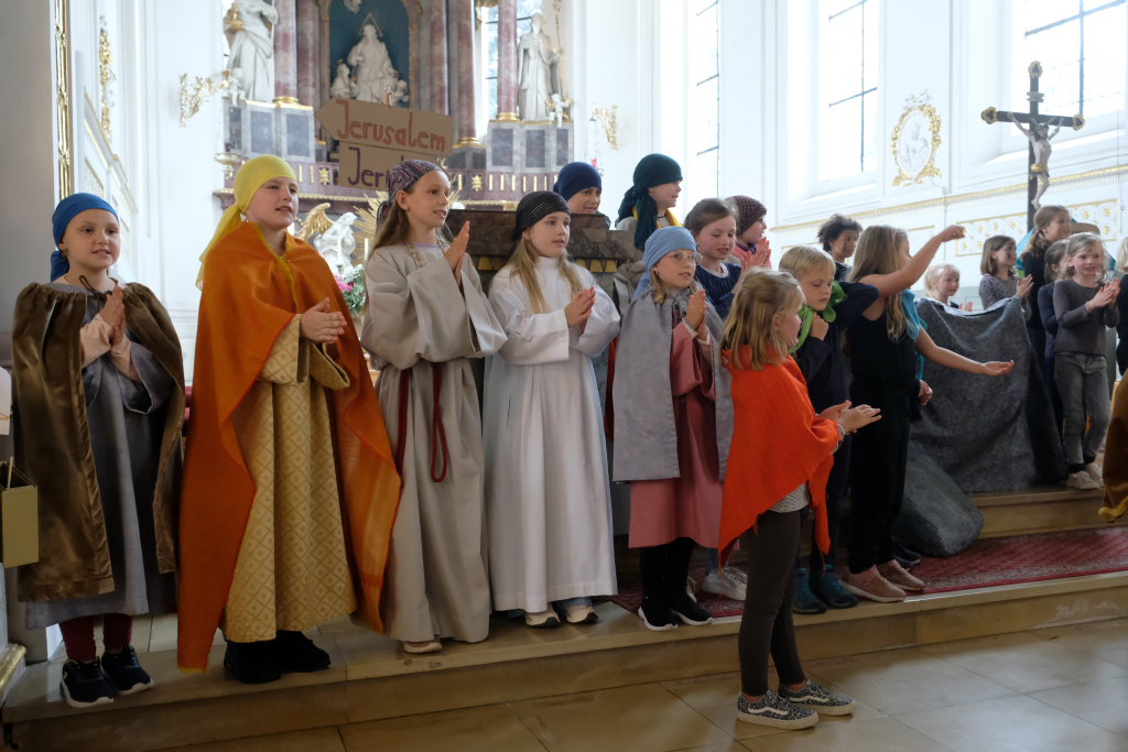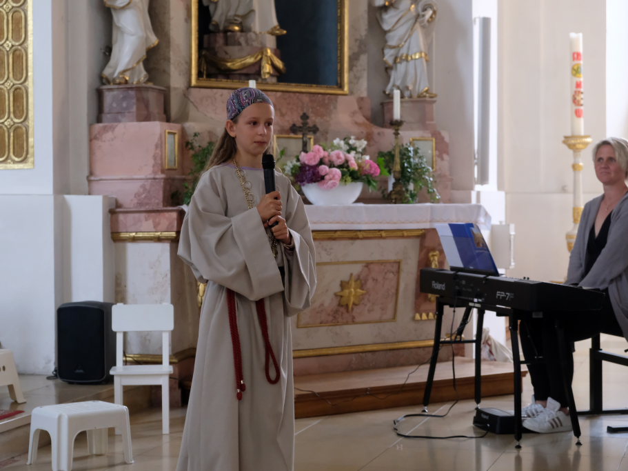 Das erste Mal spielten sie es vor zahlreichen Eltern, Verwandten und Freuden nach dem Festgottesdienst. Die Musikalische Leitung hatte Bernadette Vogt inne, die die Lieder am Piano begleitete. Regie führte Bernadette Miller, die den kleinen Akteuren jeweils die nächste Szene anzeigte. Ausgestattet mit einem liebevoll gestalteten Bühnenbild, fantasievollen Gewändern und einer mitreissenden Musik zeigten die Kinder mit dem Gleichnis vom barmherzigen Samariter, wie topaktuell die Thematik – Gleichgültigkeit gegenüber seinen Mitmenschen und Skepsis gegenüber allem Fremden – auch heute nach 2.000 Jahren noch oder wieder ist.