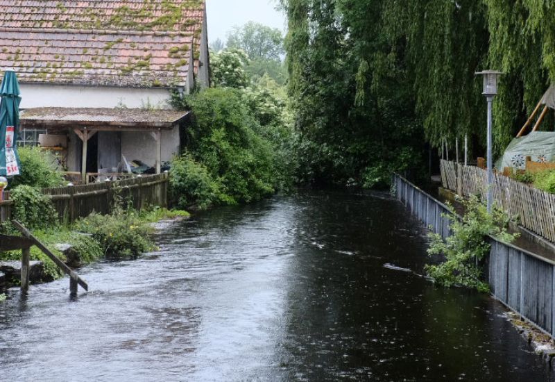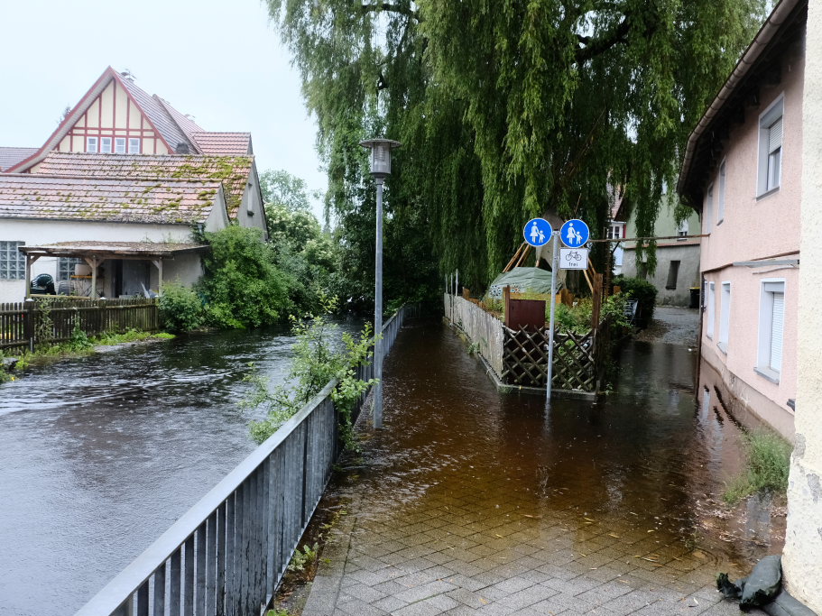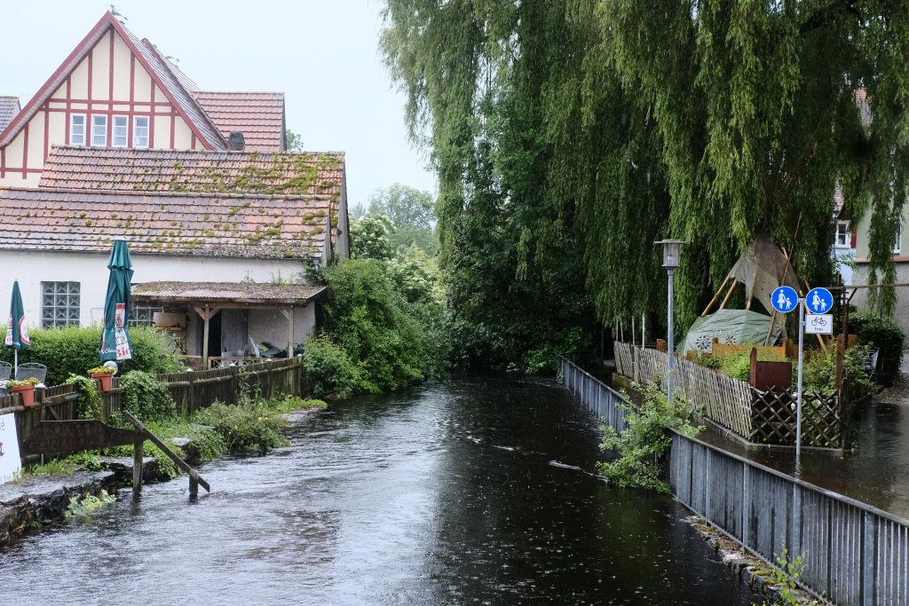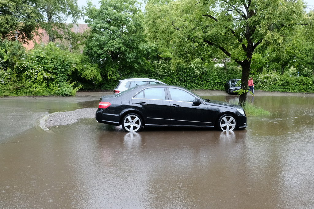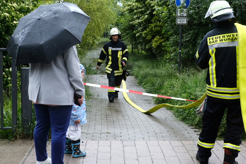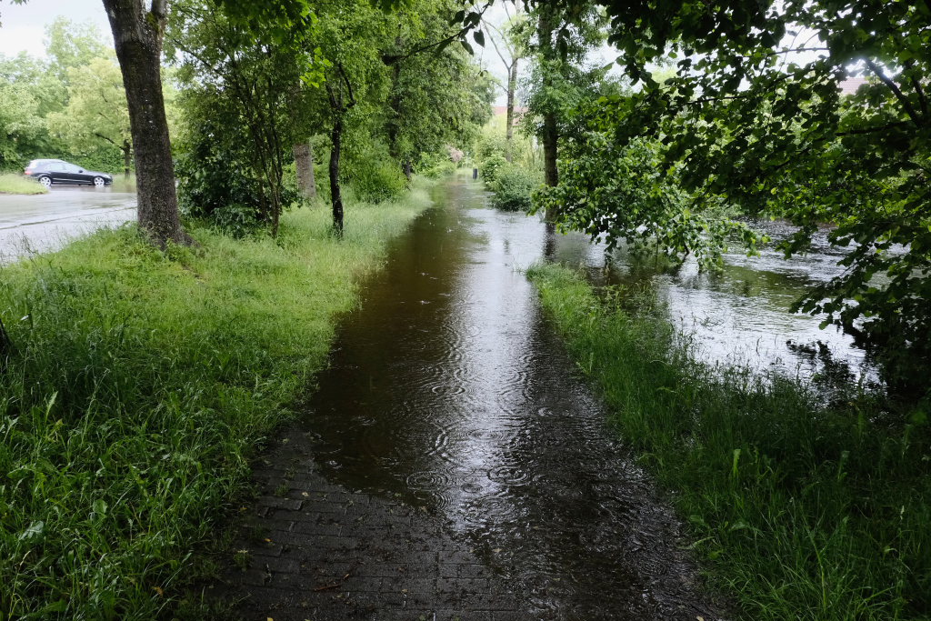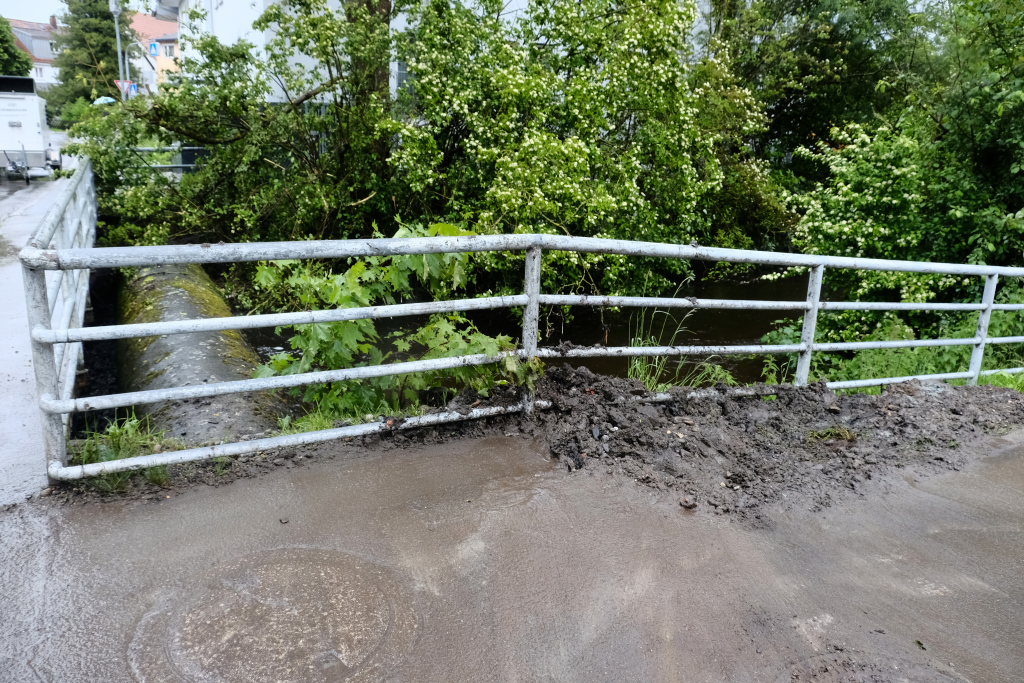 Bad Wurzach – Neben den Brücken im Kurpark waren besonders die Bereiche des Achuferweges mit ihren Brücken betroffen. Teilweise stand um etwa 14.00 Uhr der Achuferweg 20 bis 30 cm unter Wasser, etwa im Bereich des Amtshausparkplatzes, wo das Rondell durch seine runde Form prädestiniert ist, bei Dauerregen vollzulaufen. Im Espenweg bei der dortigen Brücke musste die Feuerwehr Keller und Tiefgarage auspumpen, weil Brücken bei höherem Wasserstand als Hindernisse die Wassermassen seitlich wegdrücken.