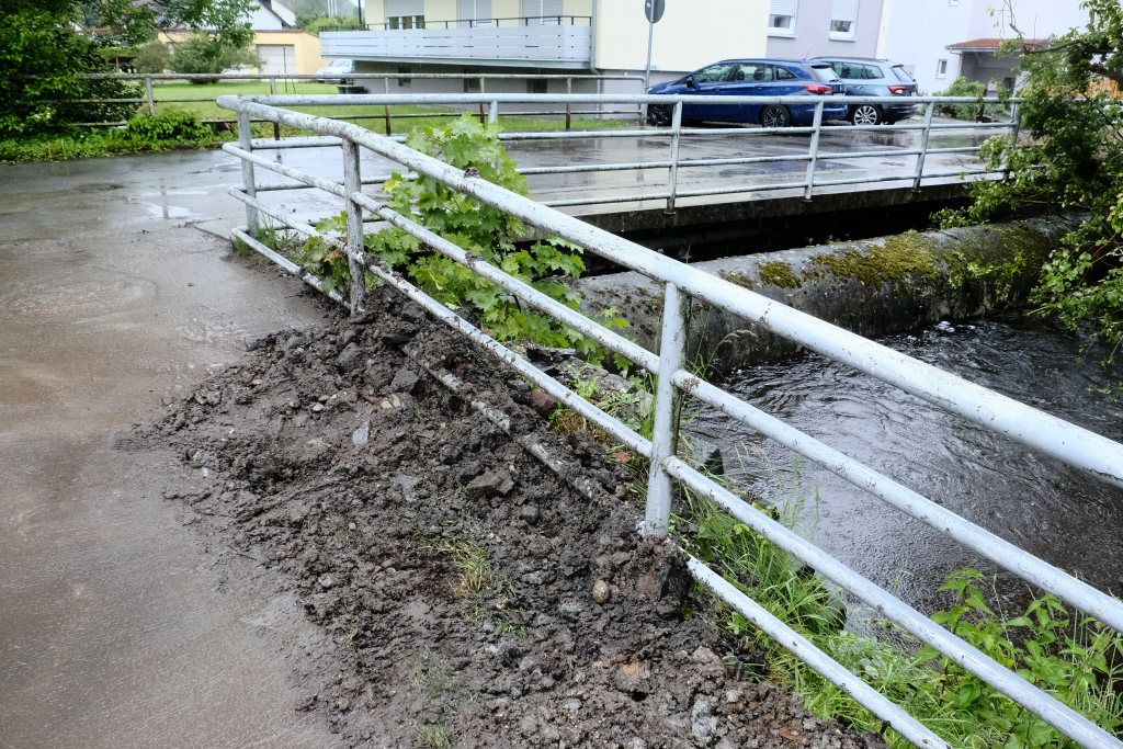 Bei der Achbergbrücke musste sogar ein Bagger zum Einsatz kommen, um den angeschwemmten Schlamm zu beseitigen, die große Dole unter der Brücke bot eine große Angriffsfläche.