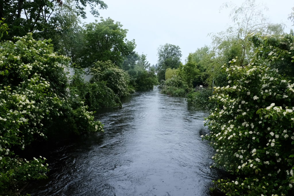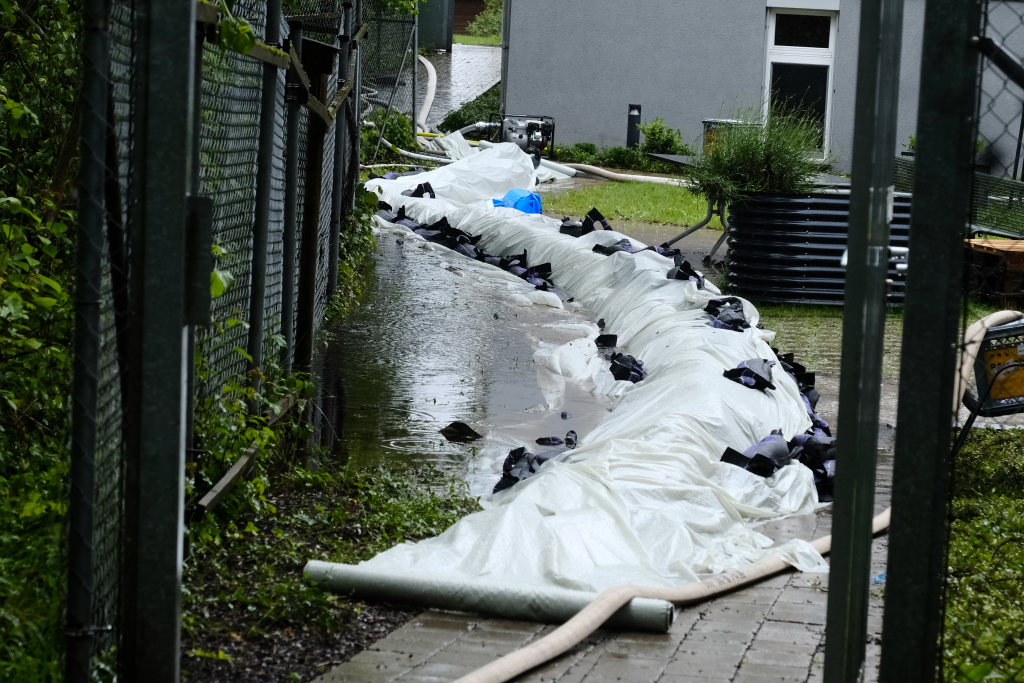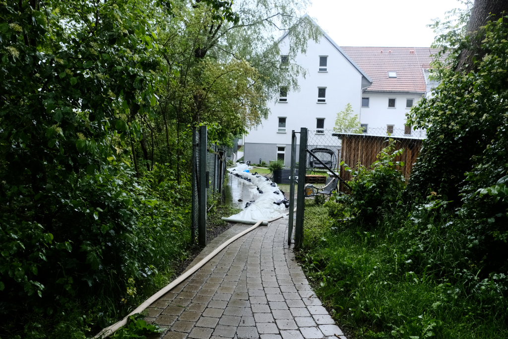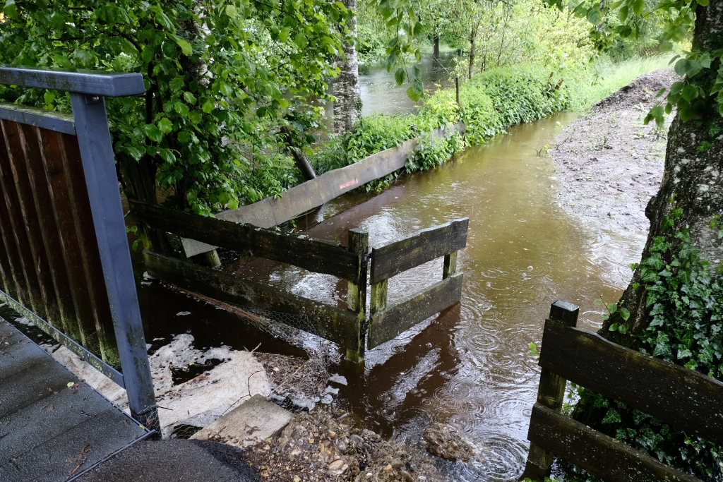 Aber auch die große Fußgängerbrücke mit ihren tiefliegenden Stahlträgern sorgte auf dem gegenüberliegenden Grundstück für „Land unter“. Da dort jedoch von einer Baustelle noch viel Aushub vorhanden war, entschloss sich der Besitzer damit zum Bau eines Dammes, um Schlimmeres zu verhindern.