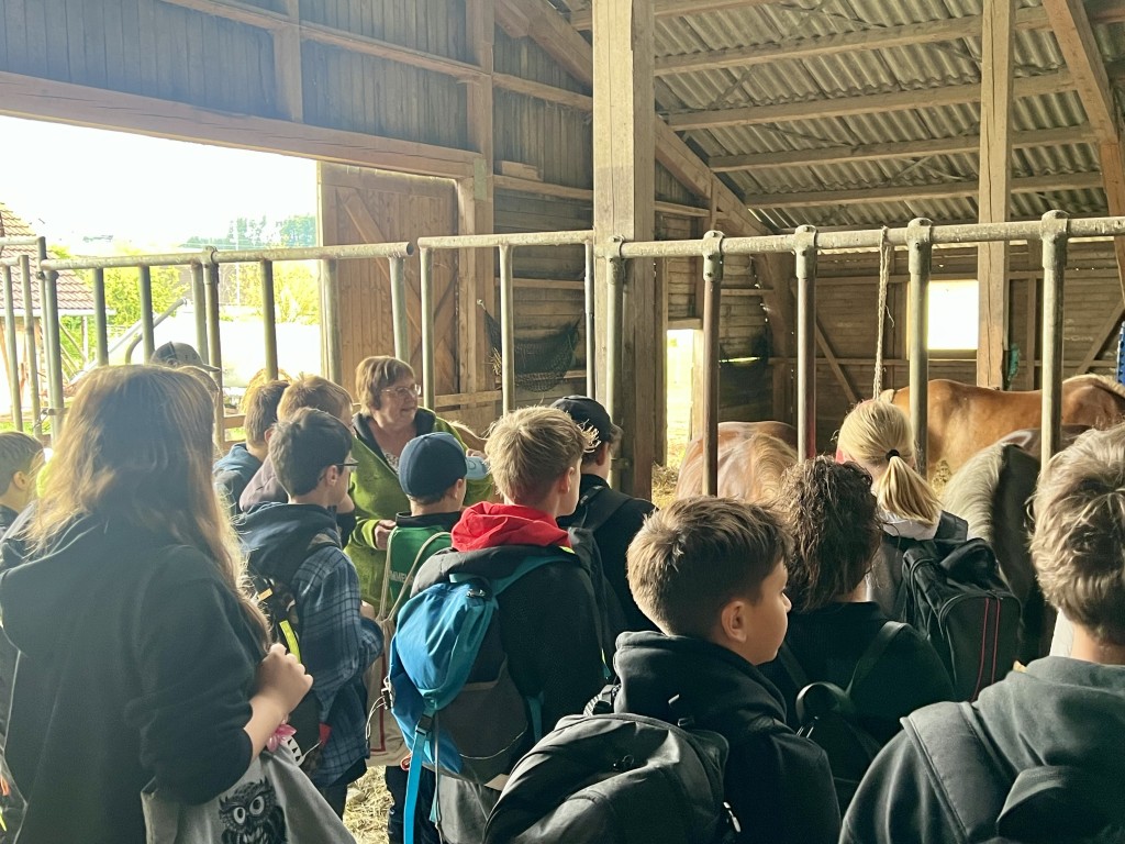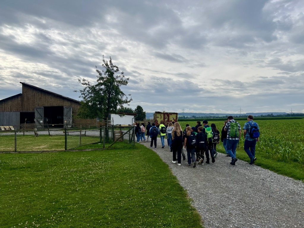 Haidgau – Wo Reisende aus aller Welt Urlaub machen, erlebten über 20 Schülerinnen und Schüler der Werkrealschule Bad Wurzach zwischen Feldern, Ställen und Scheunen einen ganz besonderen Vormittag: Familie Rösch aus Haidgau öffnete für die Klasse 5g ihre Tore und gewährte den Schülerinnen und Schülern spannende Einblicke in ihren Familienbetrieb und in die Arbeit als Landwirte.