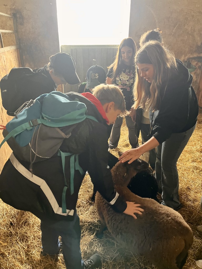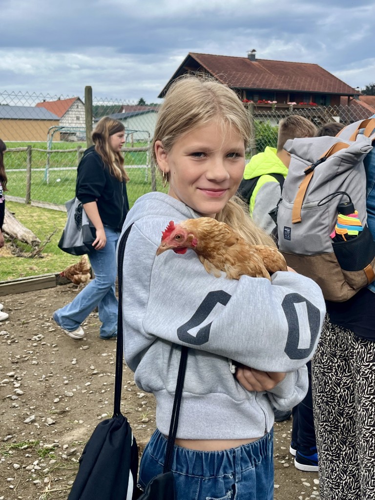 Schon bei der Ankunft wurden die Kinder herzlich von Familie Rösch begrüßt. Danach ging es auf Erkundungstour: Oma Rösch führte die Gruppe zunächst in den Pferdestall und erzählte den Schülerinnen und Schülern einiges über die unterschiedlichen Pferderassen auf dem Hof. So lernten die Besucher, dass die Haflinger aus Südtirol stammen und durch die dortige Ortschaft „Hafling“ zu ihrem Namen gelangten. Weiter ging es durch den Stall zwischen jungen Schafen und Kälbchen. Der ein oder andere Schüler wäre am liebsten direkt bei den flauschigen Tieren geblieben. Auch die Schäfchen, die Frau Rösch mit der Flasche aufzog, genossen die extra Portion Streicheleinheiten. Noch ein bisschen mehr Aufmerksamkeit als gewöhnlich bekamen auch die Hühner, Katzen und Ziegen an diesem Tag.