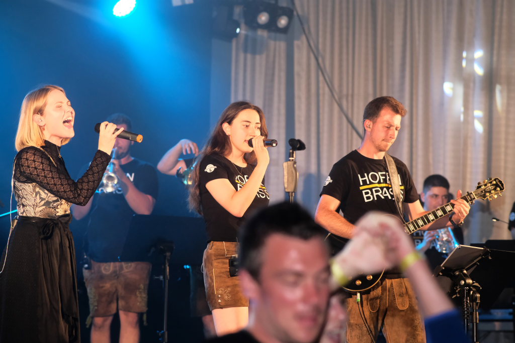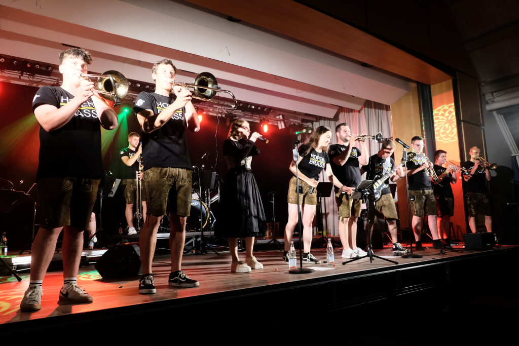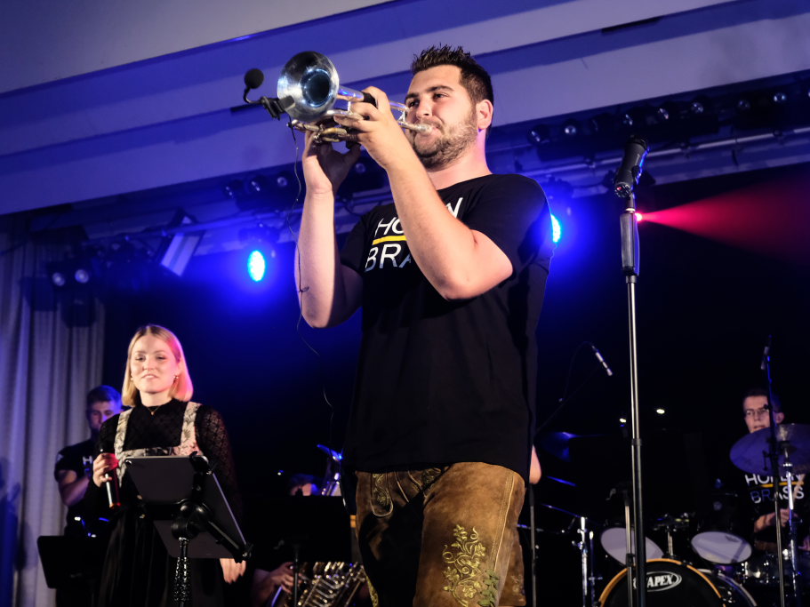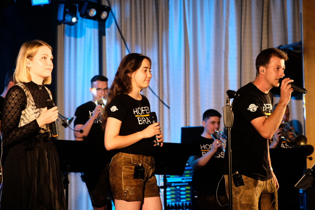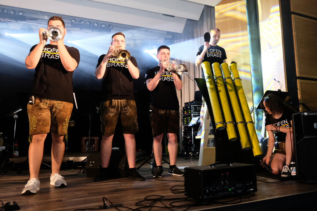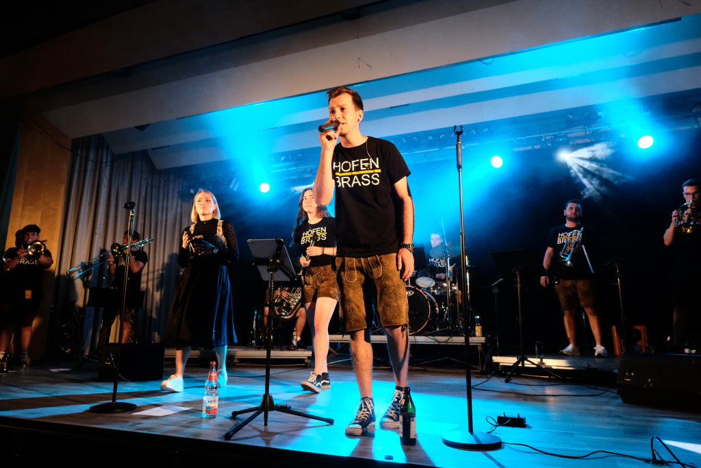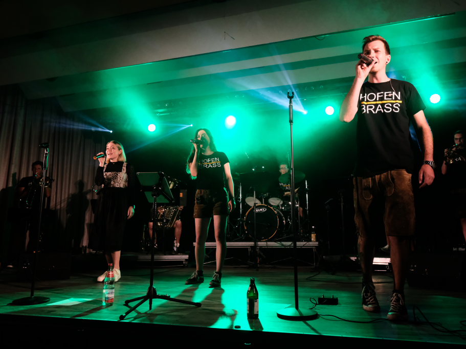 Nach einer kurzen Umbaupause – die Musiker tauschten ihre Trachten gegen ihr lässiges „Hofenbrass-T-Shirt“ – ging es mit virtuos gespielten Pop-, Rock- und Schlagermusik weiter. „Skandal im Sperrbezirk“ der Münchner “Spider Murphy Gang”, mit dem die Hofenbrass-Musiker aus der Pause zurückkamen, kam Anfang der 80er-Jahre noch auf Vinyl auf den Markt, da waren die Musiker und viele der Partybesucher noch nicht geboren. Dennoch brachten die Musiker damit den Saal gleich in Hochstimmung, weil das Lied generationenübergreifend schöne Erinnerungen weckt. So wie Nenas „99 Luftballons“ oder „Narcotic“ von Liquido, zu dem ein Kommentator vor wenigen Wochen unter das Youtube-Musikvideo schrieb: „Das Lied (wieder)entdeckt, und zack bin ich wieder 19 und mit meinem roten Flitzer auf dem Weg zum Studieren … Musikgeschichte ist auch eigene Geschichte.“