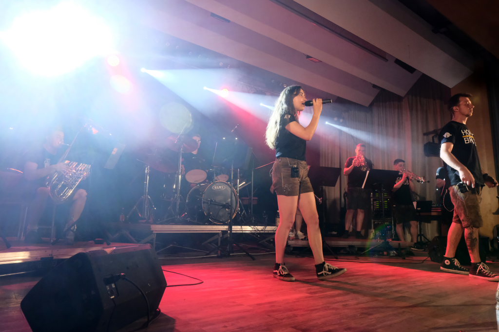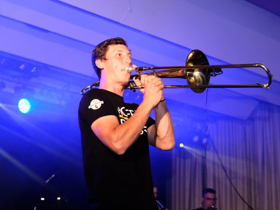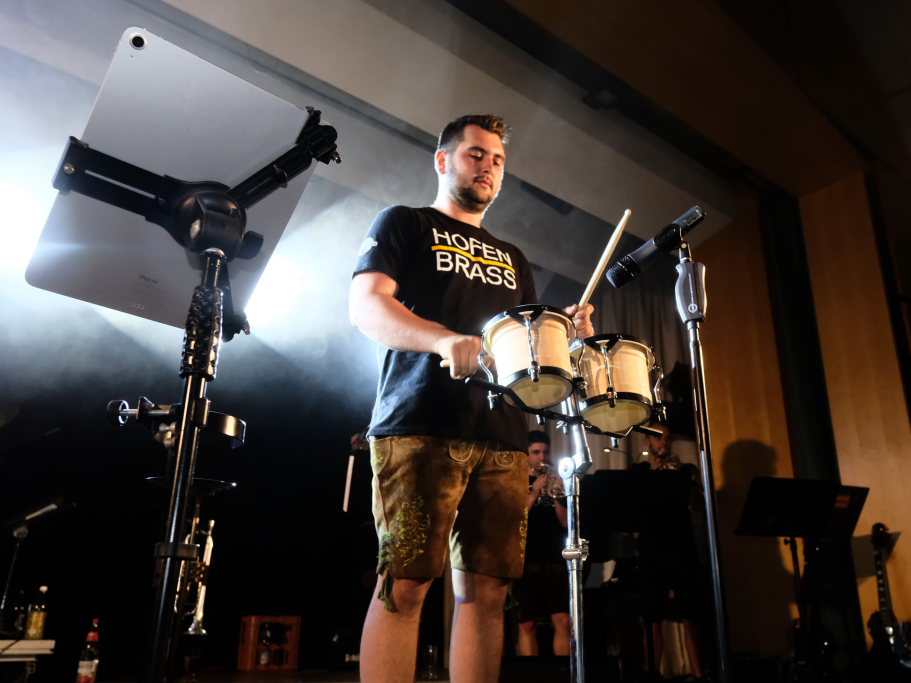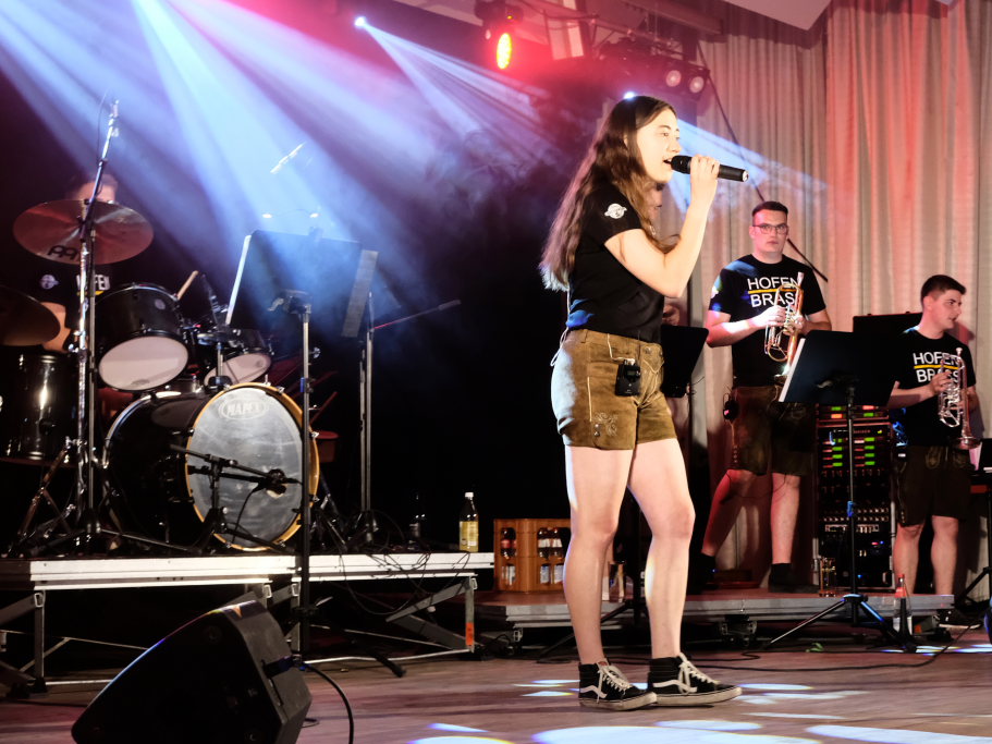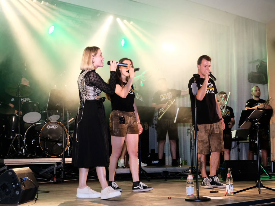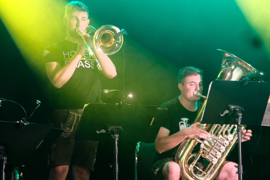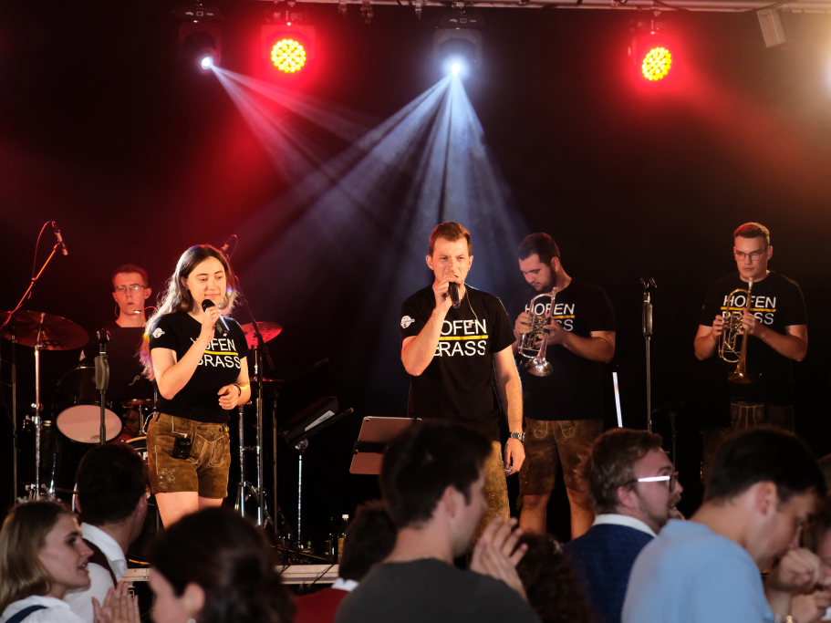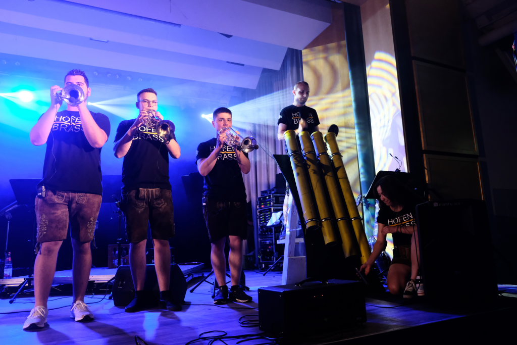 Nach einer kurzen Umbaupause – die Musiker tauschten ihre Trachten gegen ihr lässiges „Hofenbrass-T-Shirt“ – ging es mit virtuos gespielten Pop-, Rock- und Schlagermusik weiter. „Skandal im Sperrbezirk“ der Münchner “Spider Murphy Gang”, mit dem die Hofenbrass-Musiker aus der Pause zurückkamen, kam Anfang der 80er-Jahre noch auf Vinyl auf den Markt, da waren die Musiker und viele der Partybesucher noch nicht geboren. Dennoch brachten die Musiker damit den Saal gleich in Hochstimmung, weil das Lied generationenübergreifend schöne Erinnerungen weckt. So wie Nenas „99 Luftballons“ oder „Narcotic“ von Liquido, zu dem ein Kommentator vor wenigen Wochen unter das Youtube-Musikvideo schrieb: „Das Lied (wieder)entdeckt, und zack bin ich wieder 19 und mit meinem roten Flitzer auf dem Weg zum Studieren … Musikgeschichte ist auch eigene Geschichte.“