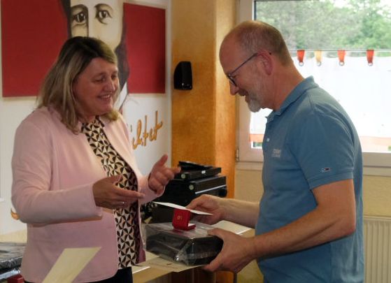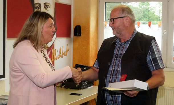 Ferdinand Steiner hat 125-mal Blut gespendet. Bürgermeisterin Scherer dankt ihm und überreicht ein Geschenk.