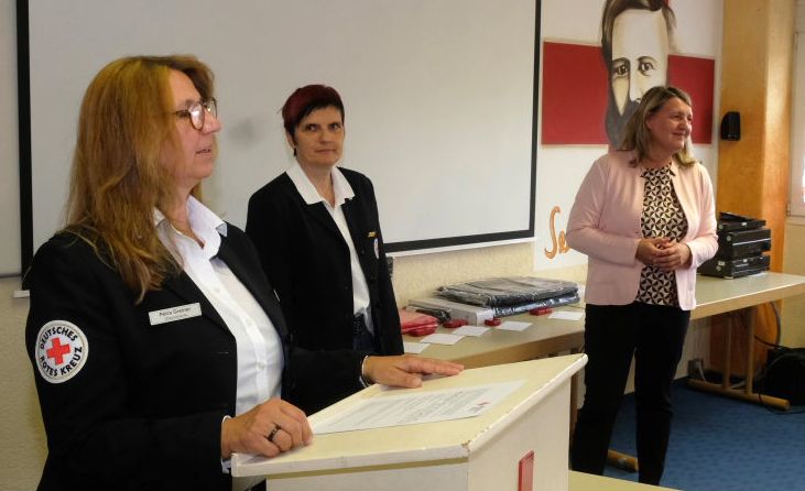 Reinhold Welte hat 150-mal Blut gespendet. Die DRK-Vorsitzende Petra Greiner und Bürgermeisterin Alexandra Scherer dankten herzlich und überreichten die Ehrennadel sowie Präsente.