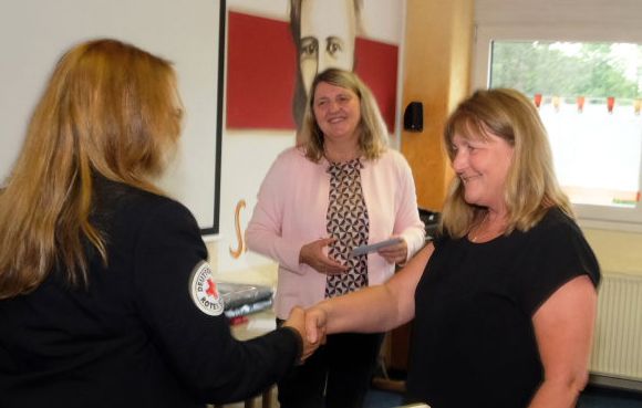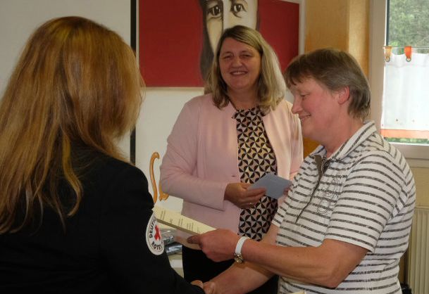 Monika Angerer erhält aus der Hand von Christa Müller-Angele die Blutspendeehrennadel für 100 Blutspenden.