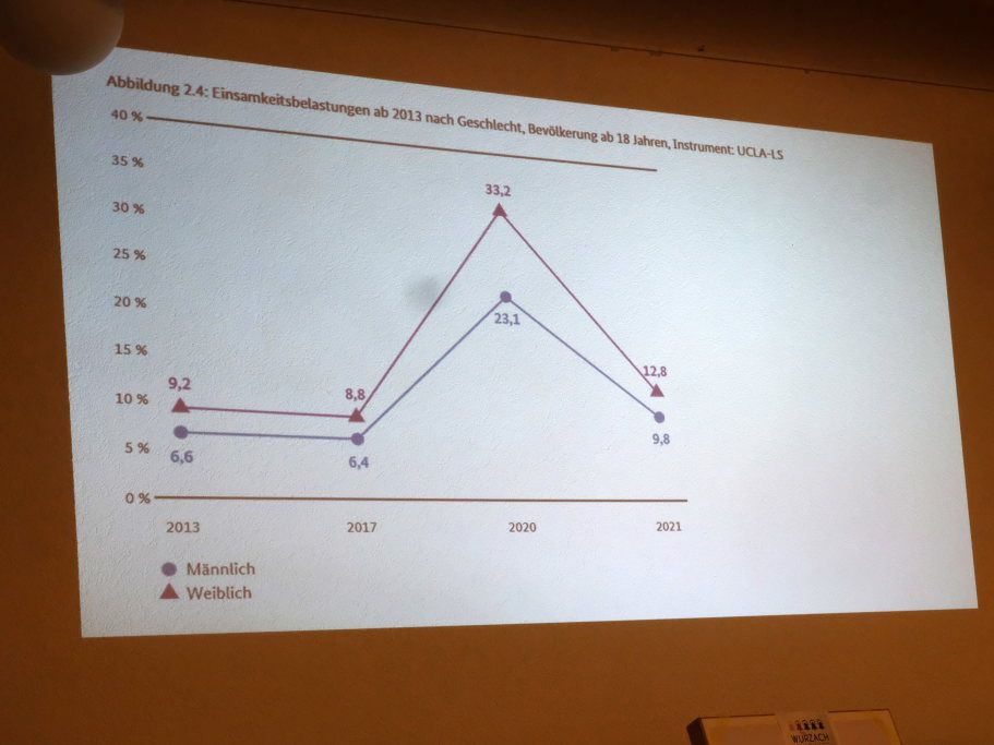 Rund acht Millionen Menschen seien in Deutschland von Einsamkeit betroffen, mit den entsprechenden Folgen: Ein Anstieg von psychischen und körperlichen Krankheiten, deren Anzahl sich nach Corona weiter erhöht hat. Risikofaktoren seine das Fehlen engerer Beziehungen, aber auch Arbeitslosigkeit und das alleine erziehen von Kindern. Auch die Art des Umgangs – unter anderem durch das Fehlen von persönlichen Kontakten – habe sich gewandelt. Wichtig sei, um die psychische Belastung z.B. bei Krisen zu mildern, eine Entstigmatisierung der Gesellschaft.
